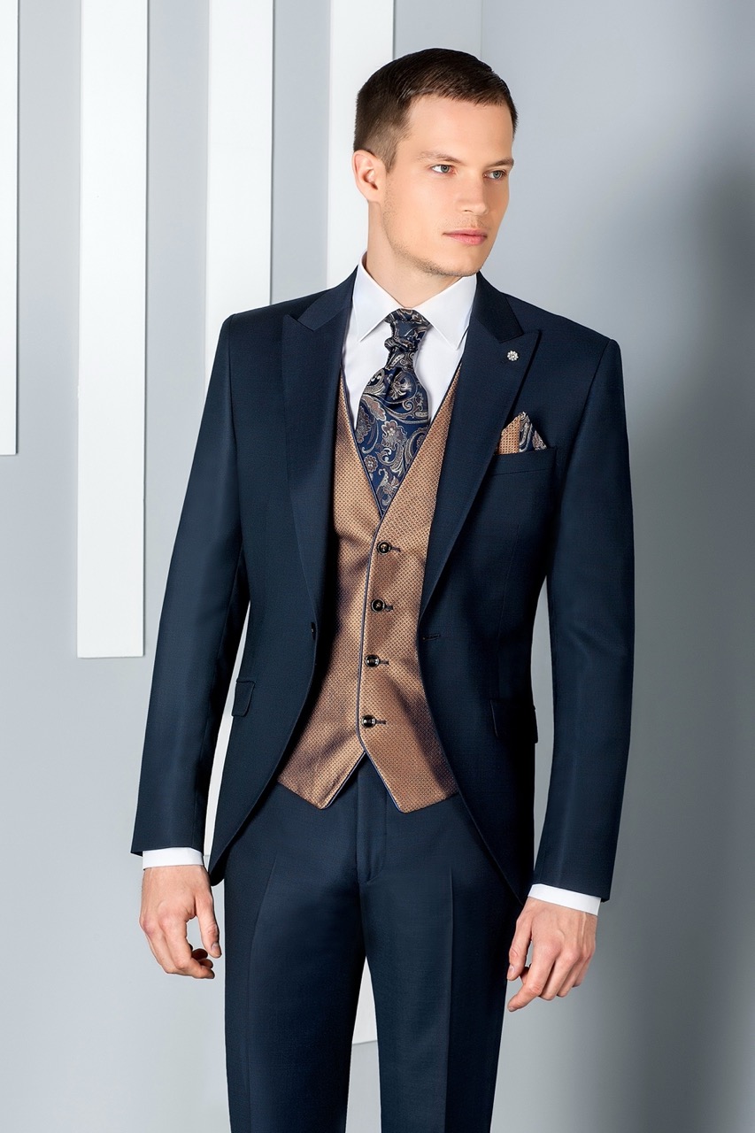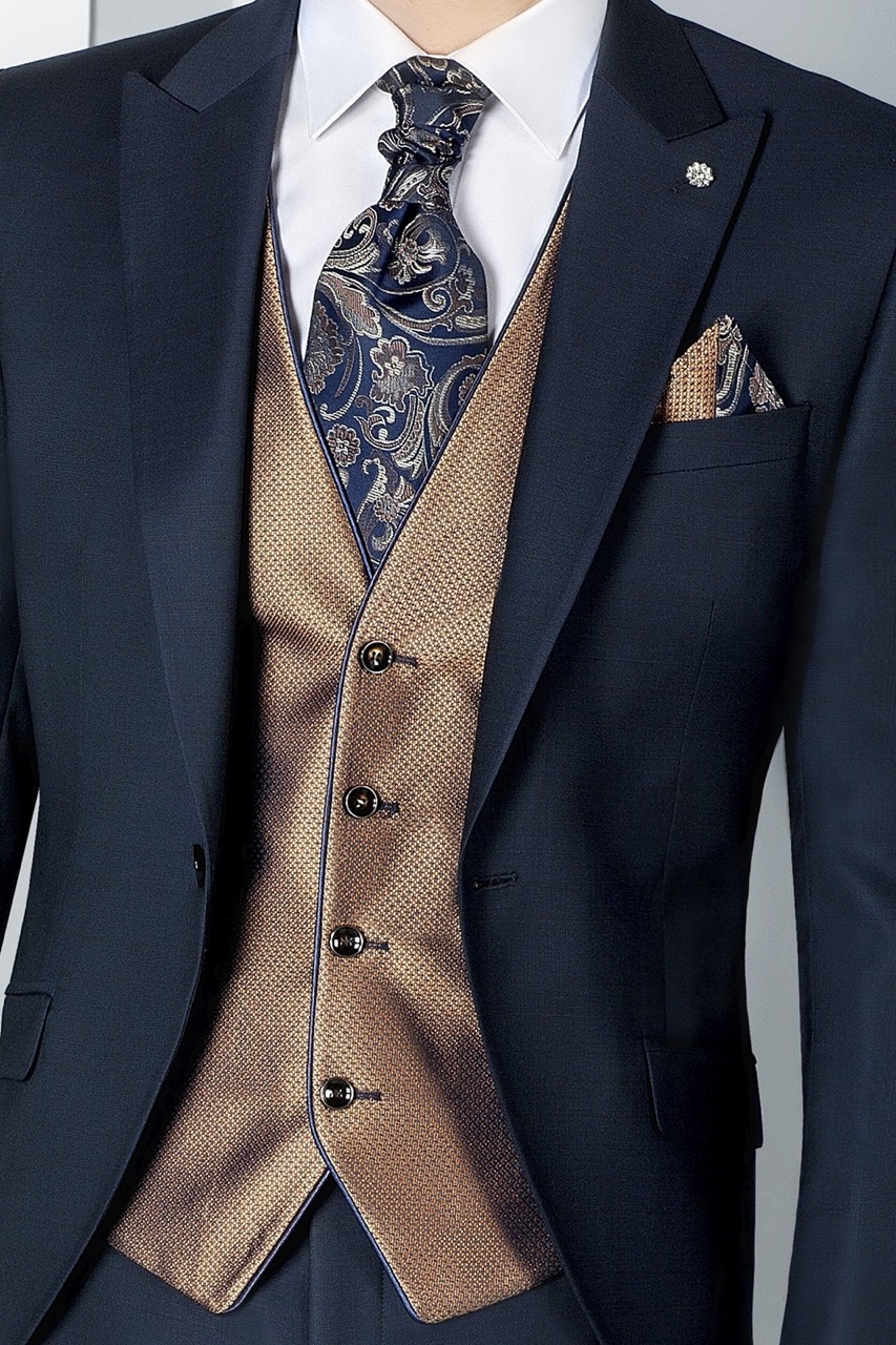 Traje de novio azul de cuadros en tejido lana. Americana con solapa en pico de 1 botón que va en contraste con chaleco de 4 botones, corbatón y pañuelo.