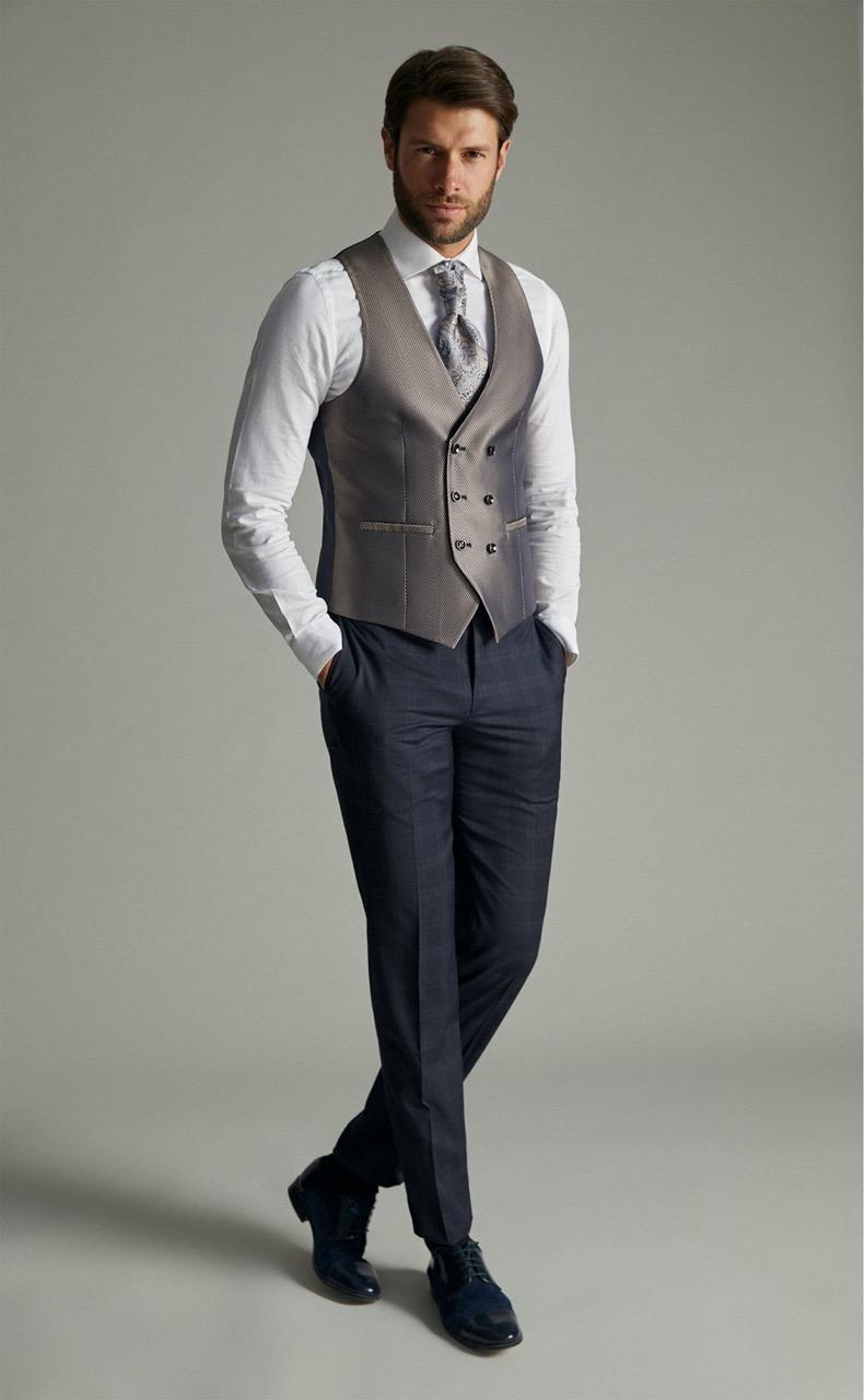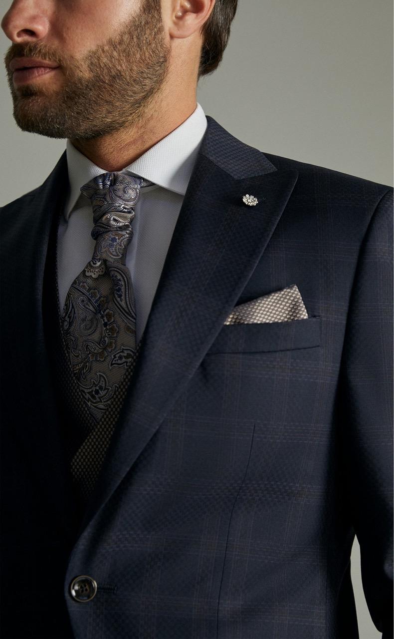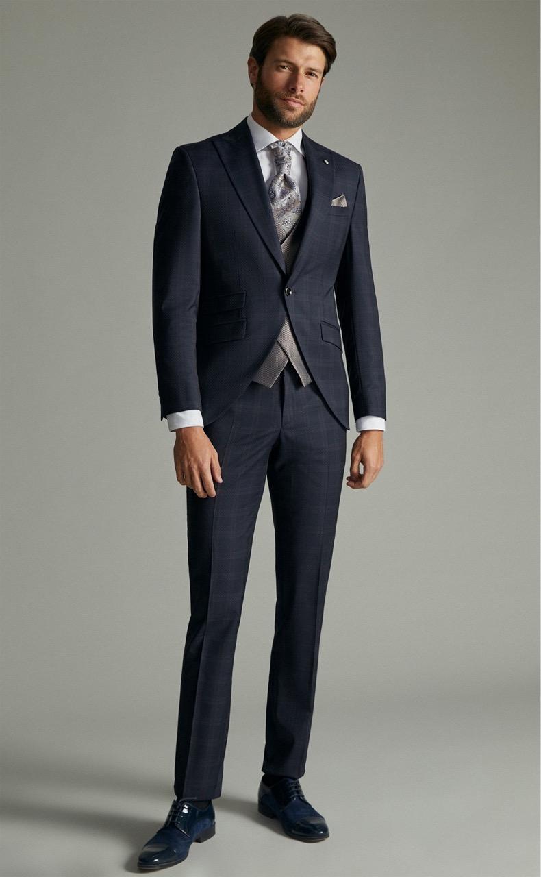 Traje de novio azul de cuadros en tejido lana y lycra. Americana con solapa en pico de 1 botón que va en contraste con chaleco cruzado de 3×3 botones, corbatón y pañuelo.