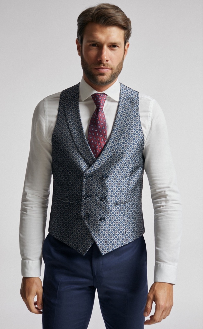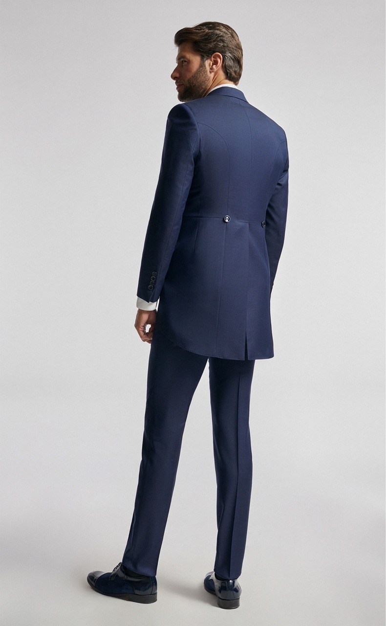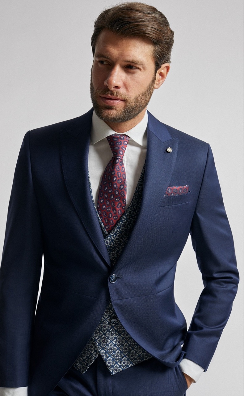 Traje de novio azul liso en tejido lana. Americana con solapa en pico de 1 botón que va en contraste con chaleco cruzado de 3×3 botones y corbata y pañuelo.
