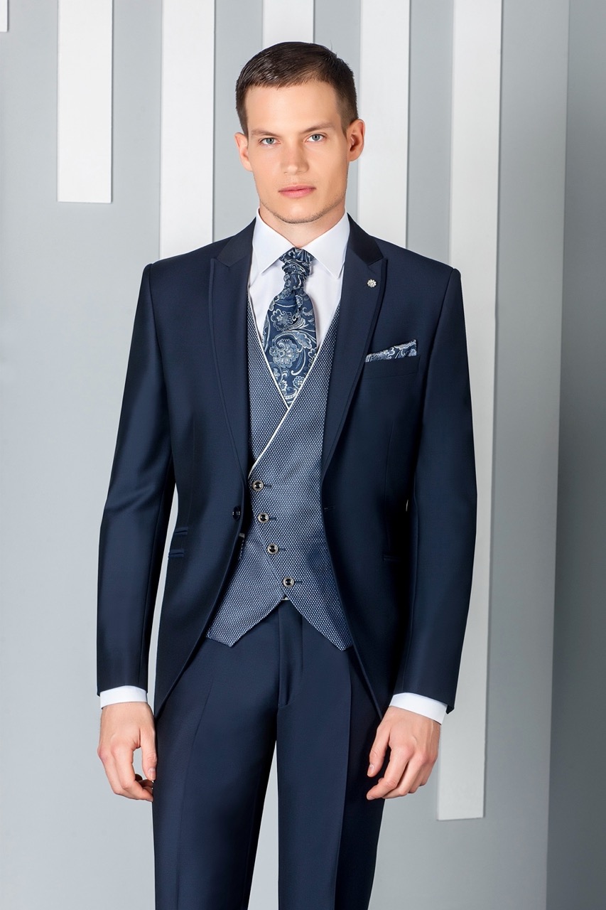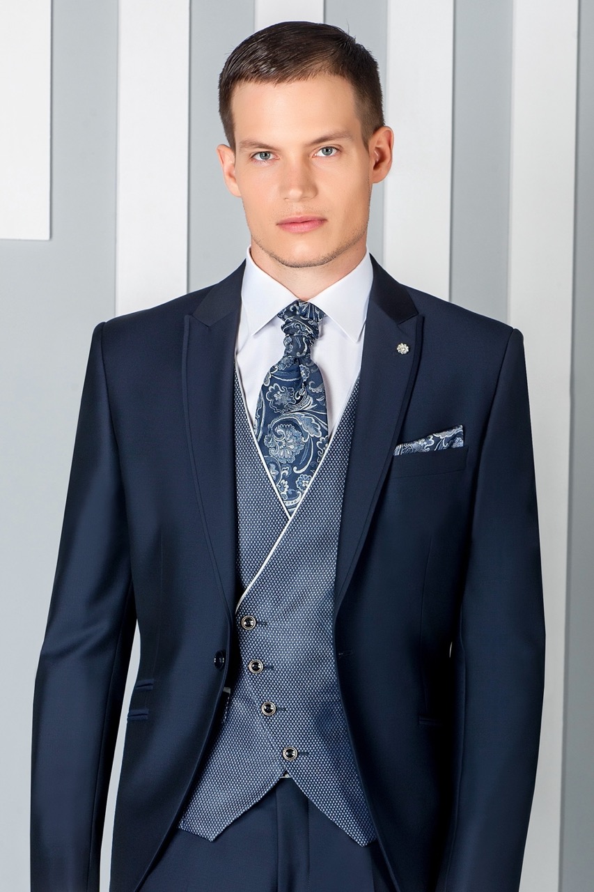 Traje de novio azul liso en tejido lana y mohair. Americana con solapa en pico de 1 botón que va en contraste con chaleco cruzado de 4 botones, corbatón y pañuelo.