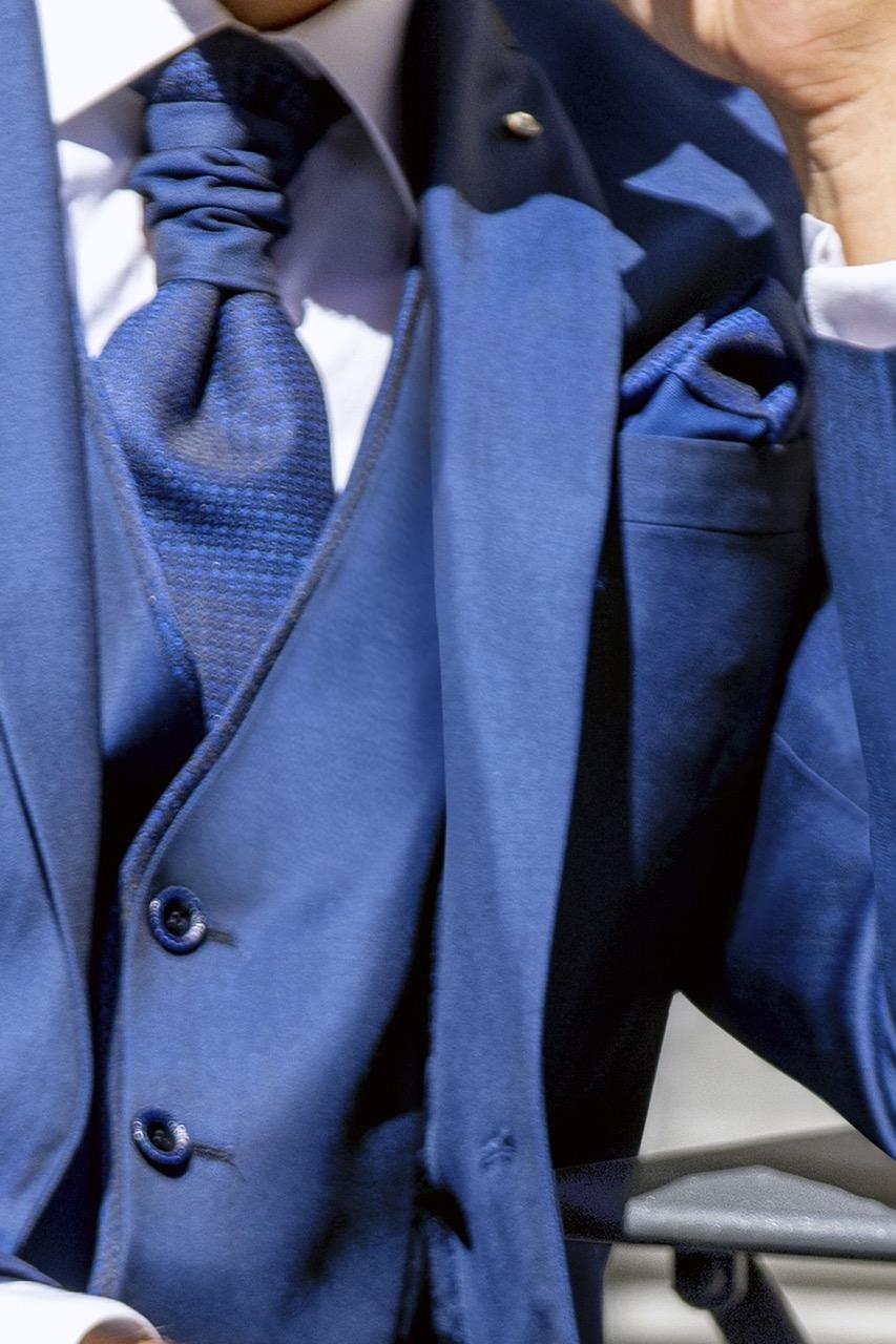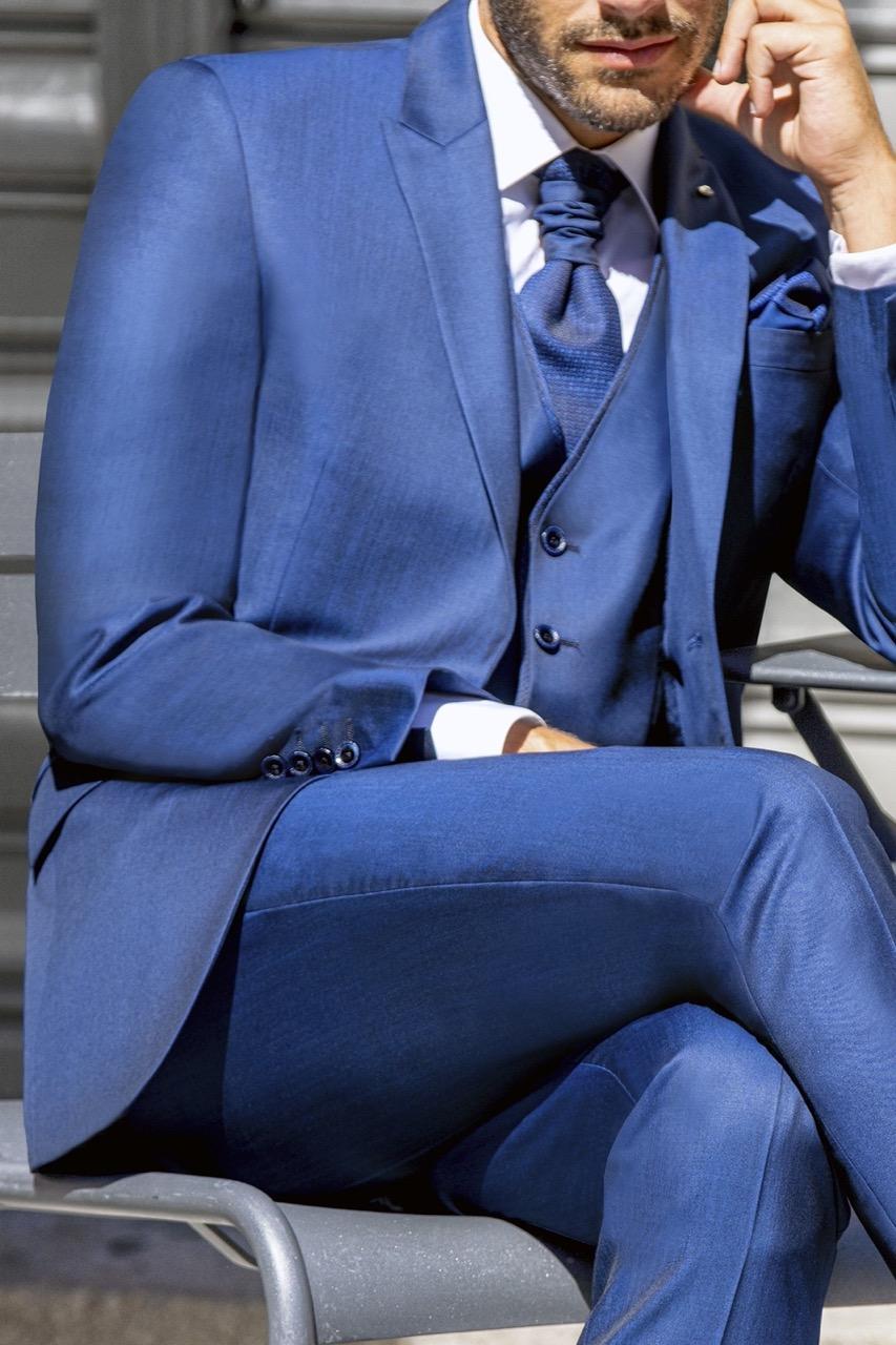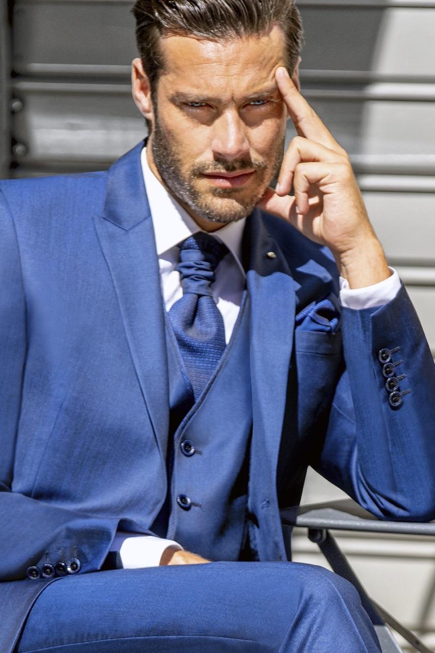 Traje de novio azul liso en tejido lana y mohair. Americana con solapa en pico de 2 botones que va con chaleco con espalda en tejido de 4 botones, corbatón y pañuelo.