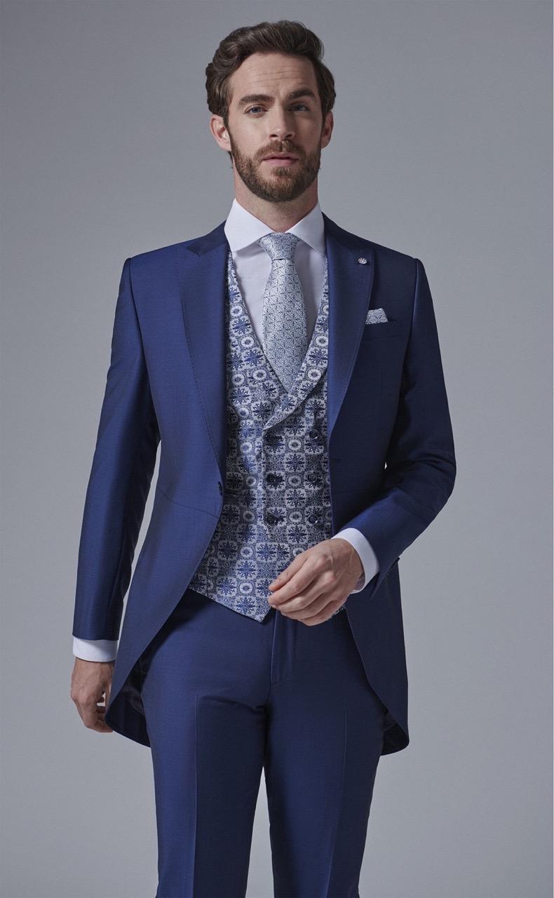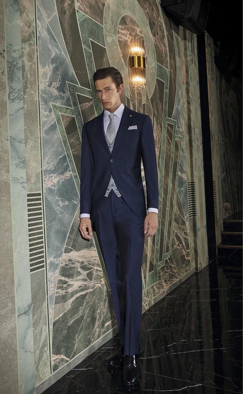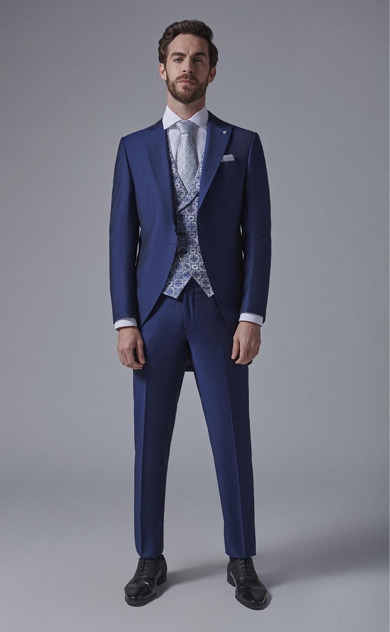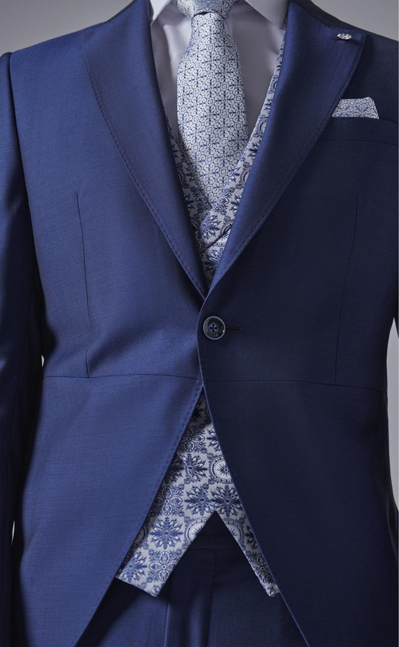 Traje de novio azul medio liso en tejido lana (SUPER 130’S) Levita con solapa en pico de 1 botón que va en contraste con chaleco cruzado con solapa y con espalda en tejido de 3×3 botones , corbata y pañuelo.