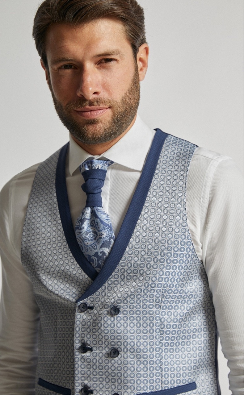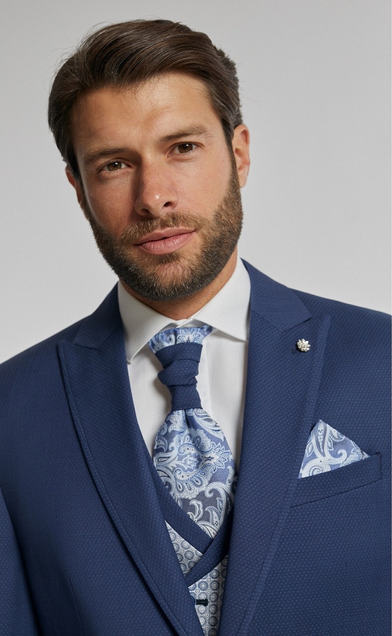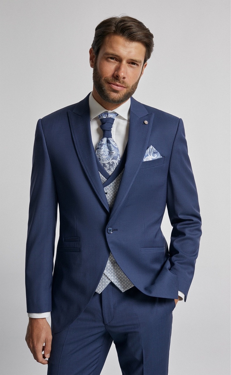 Traje de novio azul microdibujo en tejido lana y lycra. Americana con solapa en pico de 1 botón que va en contraste con chaleco cruzado de 4×4 botones, corbatón y pañuelo.