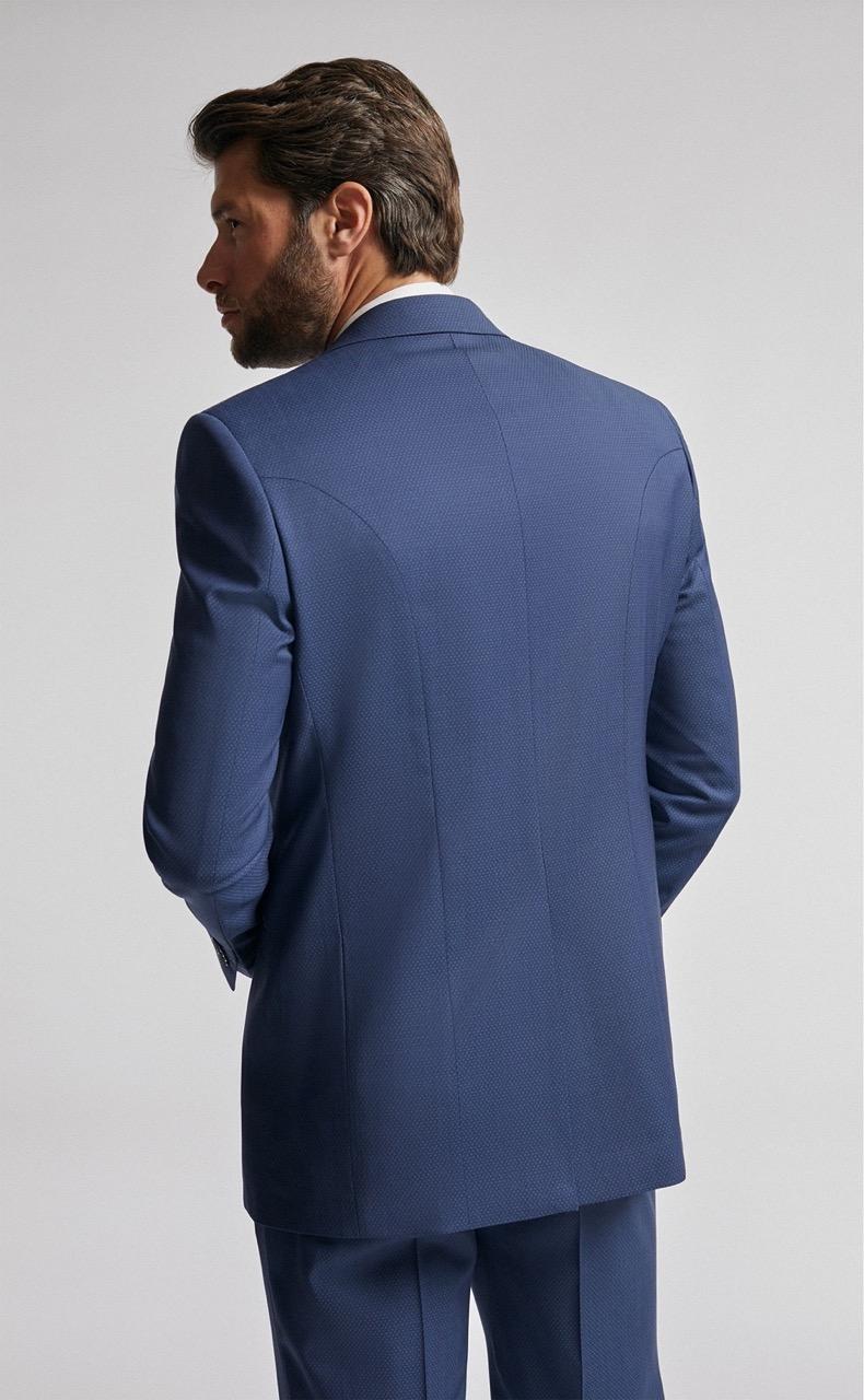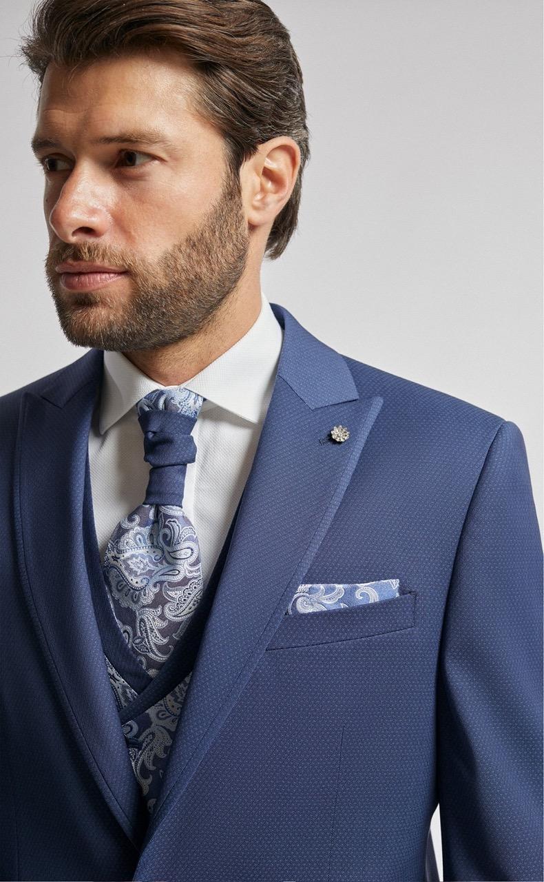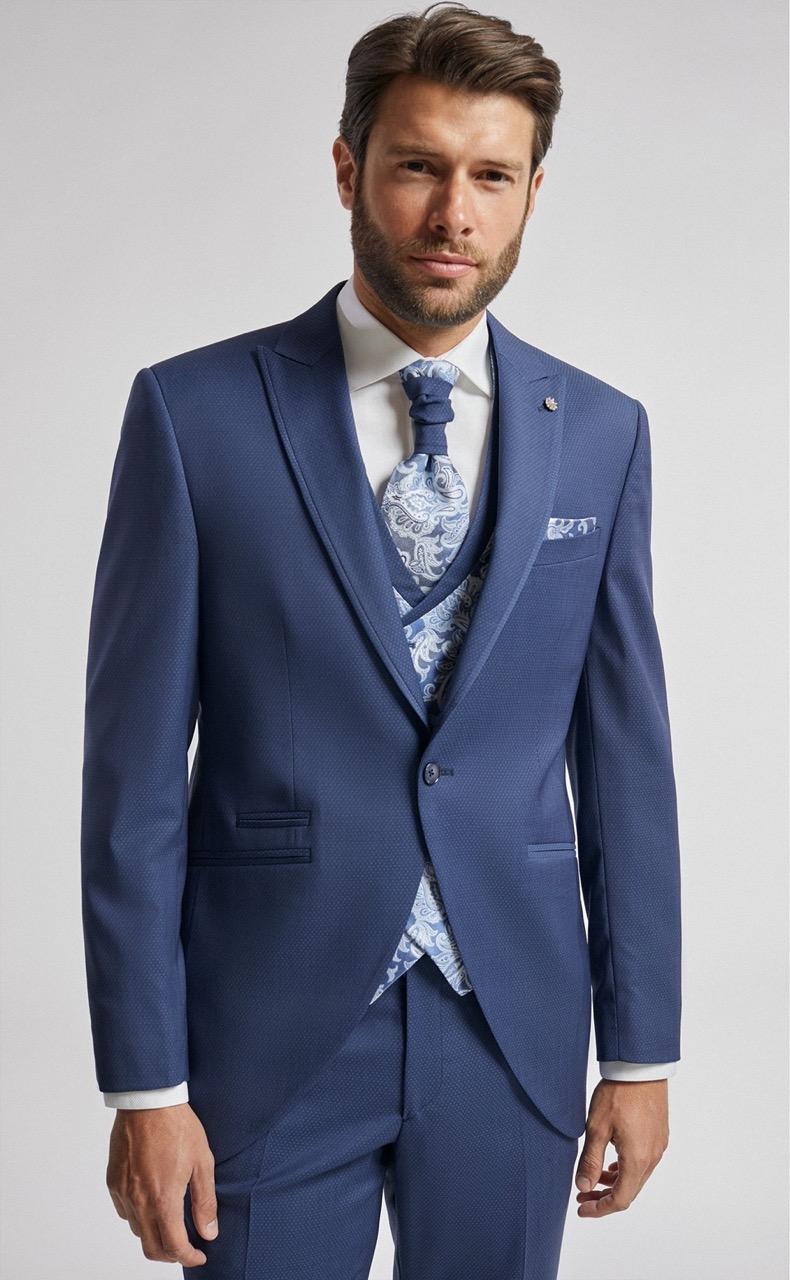Traje de novio azul microdibujo en tejido lana y lycra. Americana con solapa en pico de 1 botón que va en contraste con chaleco cruzado de 4×4 botones, corbatón y pañuelo.