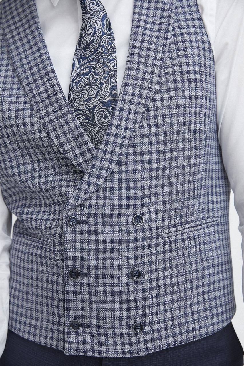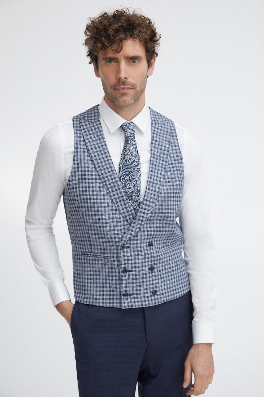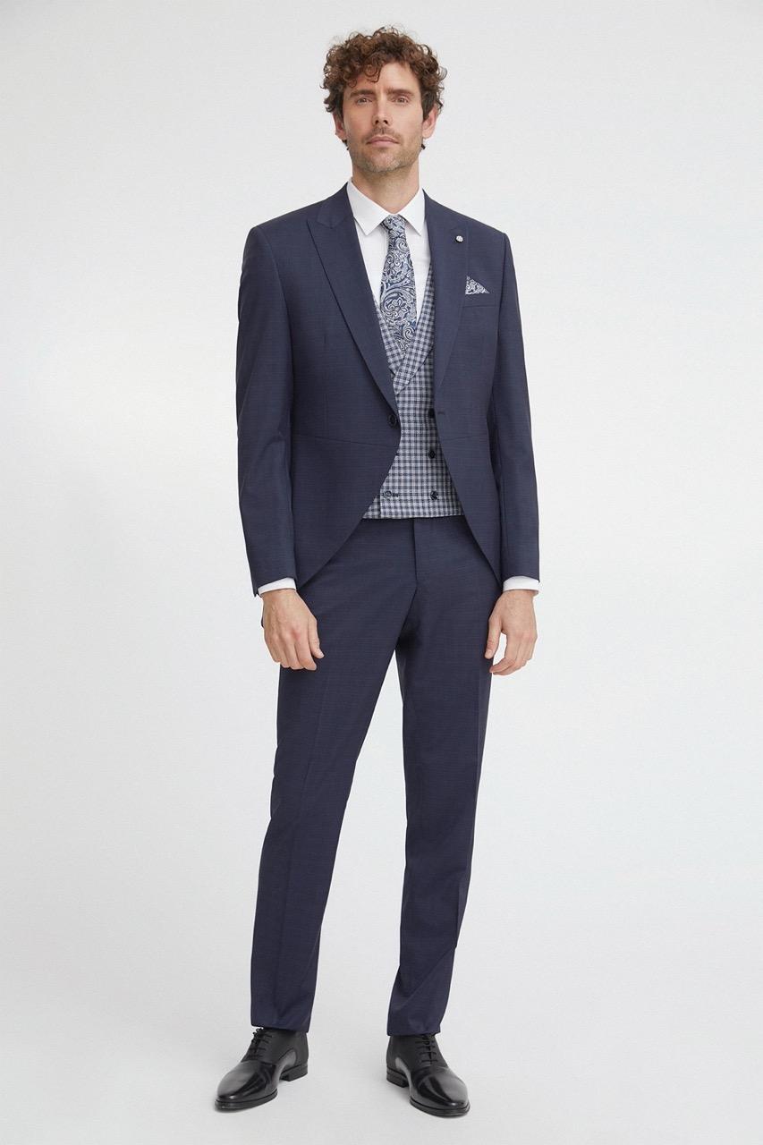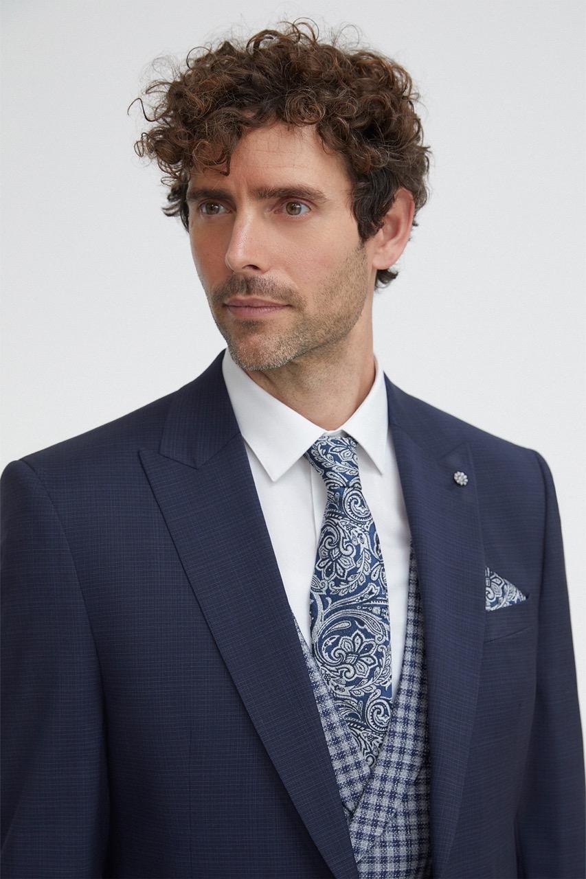 Traje de novio azul microdibujo en tejido lana y elastano. Levita con solapa en pico de 1 botón que va en contraste con chaleco cruzado con solapa de 3×3 botones, corbata y pañuelo.