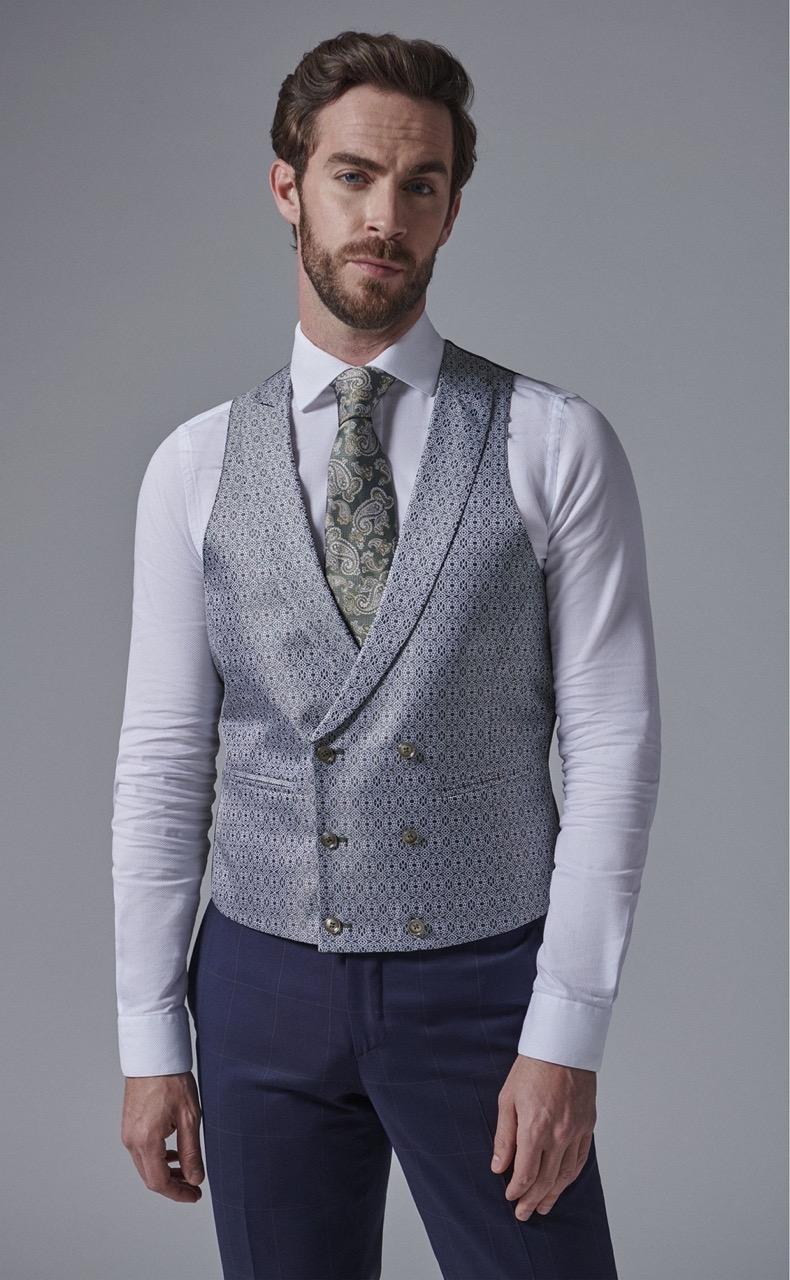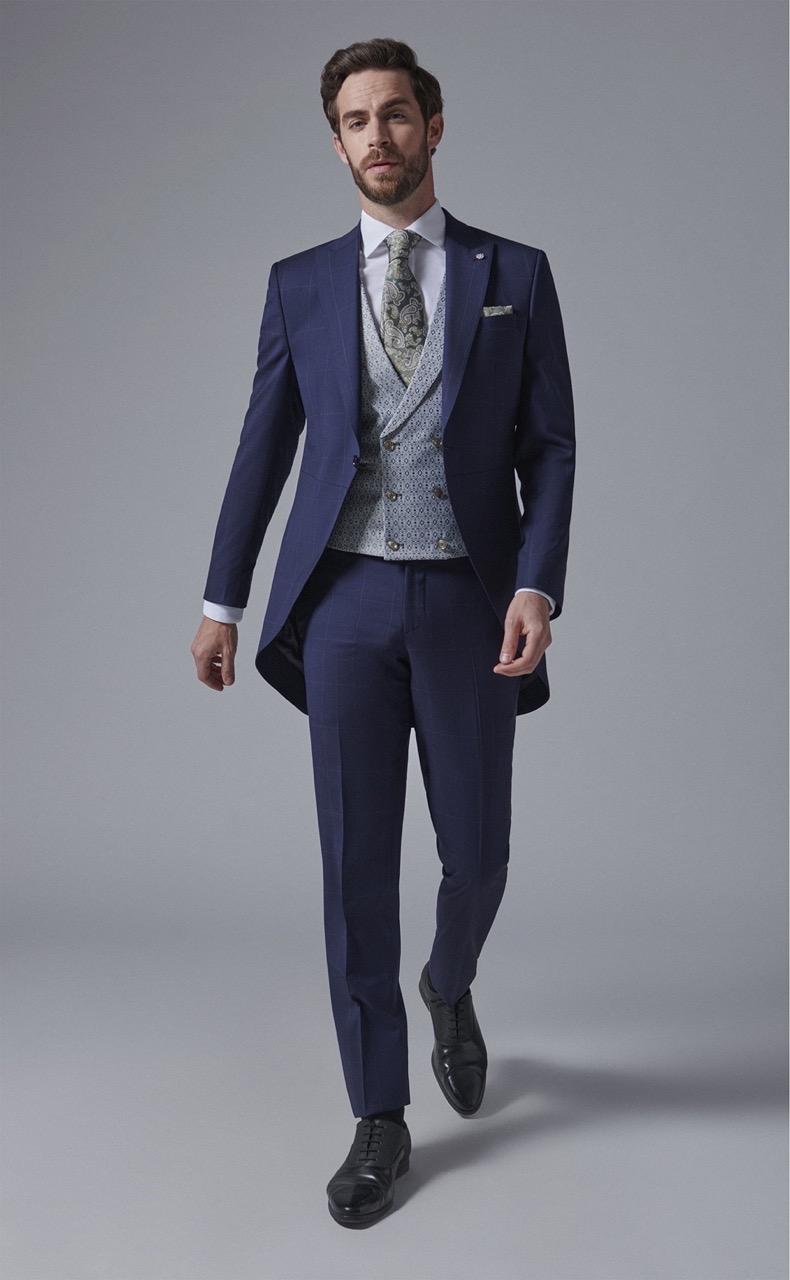 Traje de novio azul oscuro liso en tejido lana. Levita con solapa en pico de 1 botón que va en contraste con chaleco cruzado con solapa y con espalda en tejido de 3×3 botones , corbata y pañuelo.