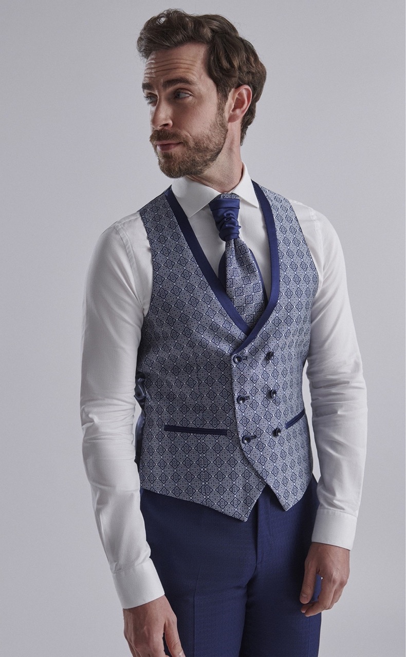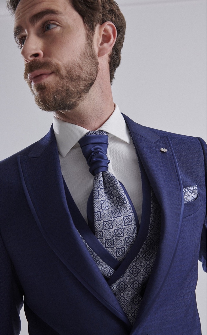 Traje de novio azul oscuro liso en tejido lana y lycra. Americana con solapa en pico de 1 botón que va en contraste con chaleco cruzado con solapa y con espalda en tejido de 3×3 botones , corbatón y pañuelo.