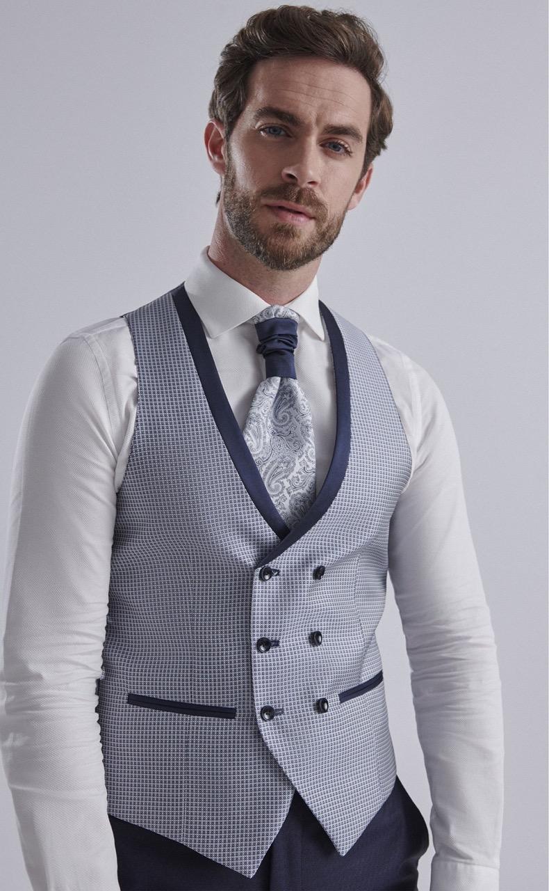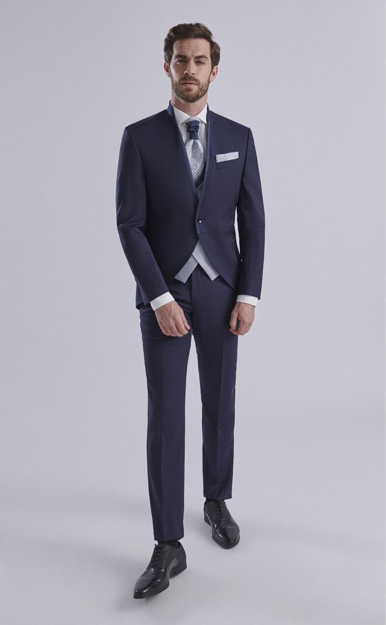 Traje de novio azul oscuro liso en tejido lana y lycra. Americana con cuello mao, 1 botón que va en contraste con chaleco cruzado con solapa y con espalda en tejido de 3×3 botones , corbatón y pañuelo.