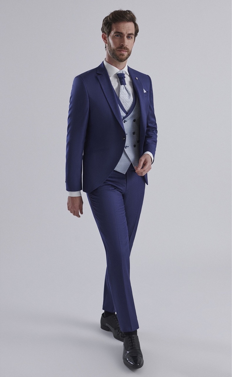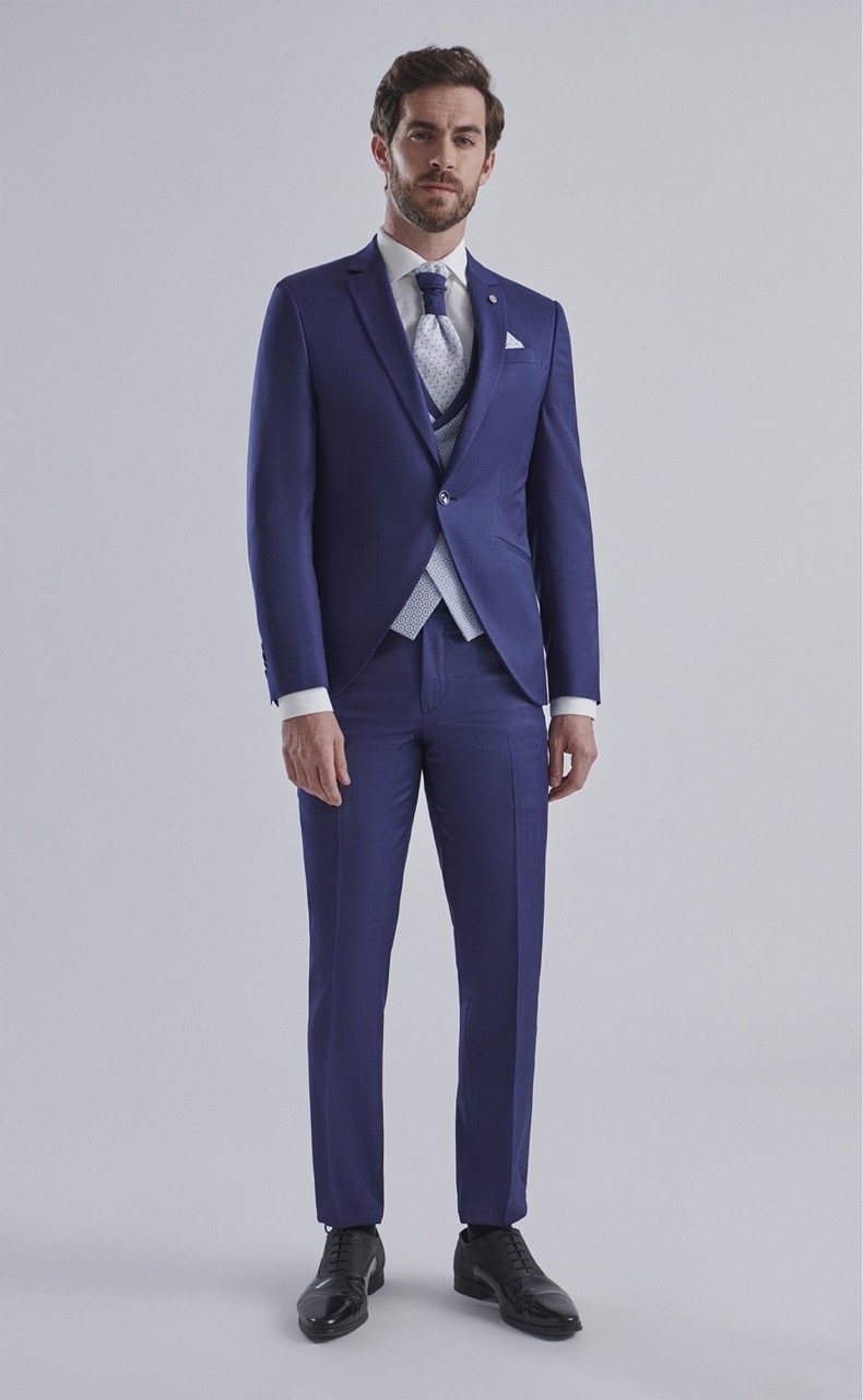 Traje de novio azul oscuro liso en tejido lana (SUPER 120’S) Americana con solapa en pico de 1 botón que va en contraste con chaleco cruzado con espalda en tejido de 3×3 botones , corbata y pañuelo.