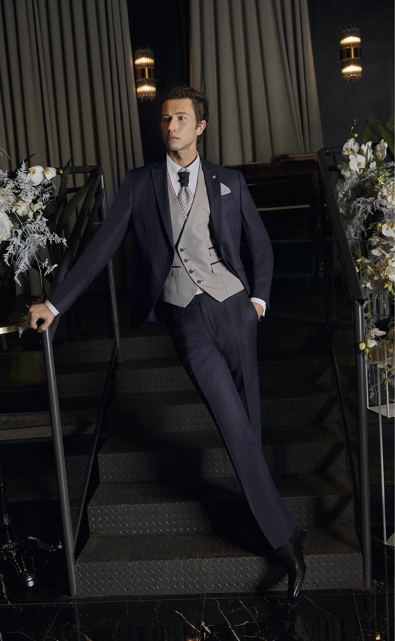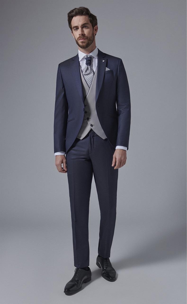 Traje de novio azul oscuro liso en tejido lana y seda. Americana con solapa en pico de 1 botón que va en contraste con chaleco cruzado con solapa y con espalda en tejido de 4 botones , corbatón y pañuelo.