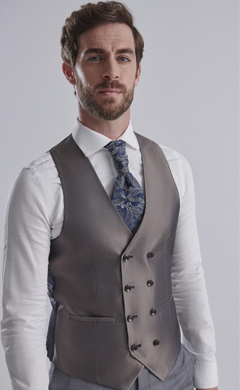 Traje de novio gris de cuadros en tejido lana y lycra. Americana con solapa en pico de 1 botón que combina com chaleco espalda en tejido y solapa 4×4 botones , corbatón y pañuelo.