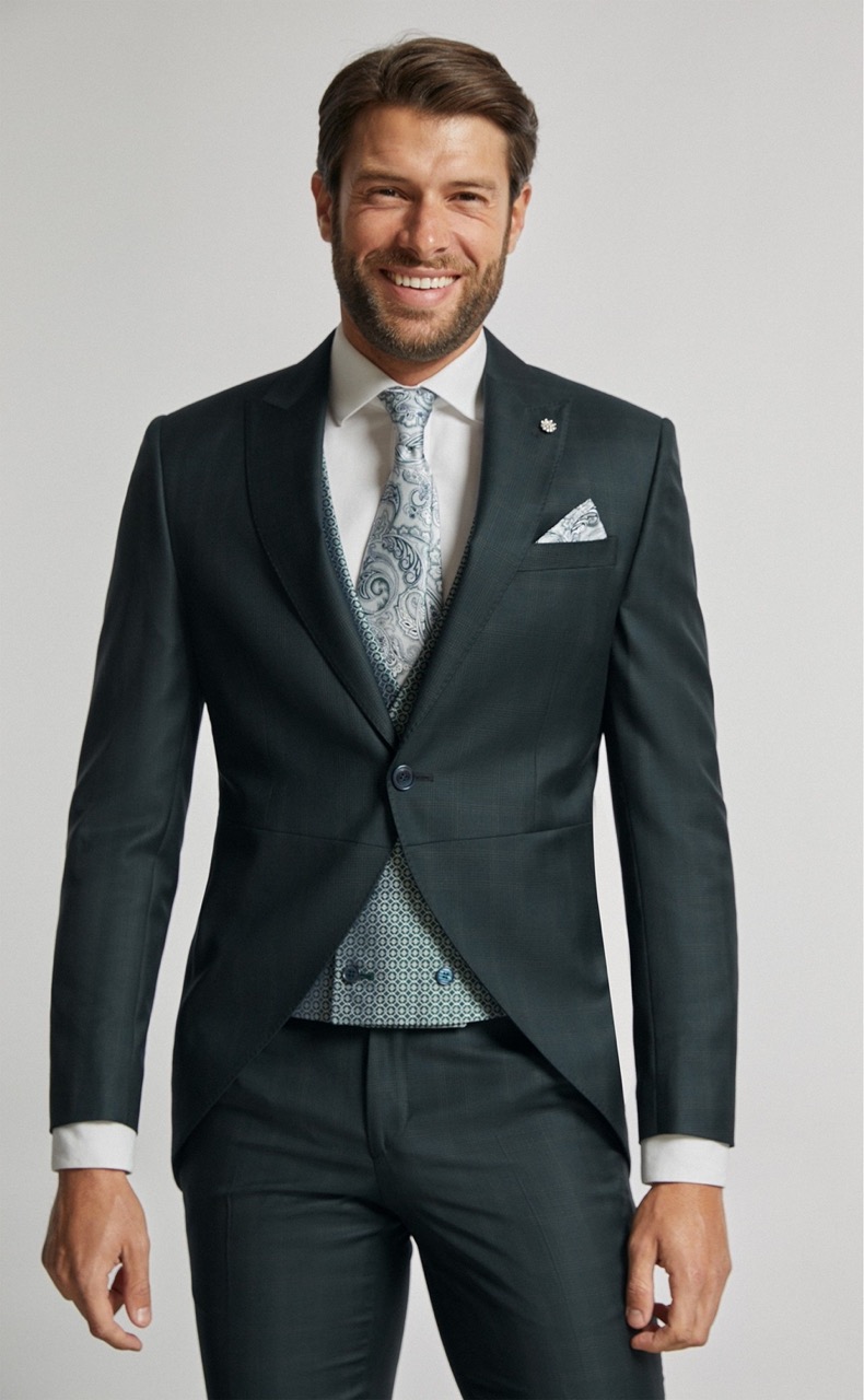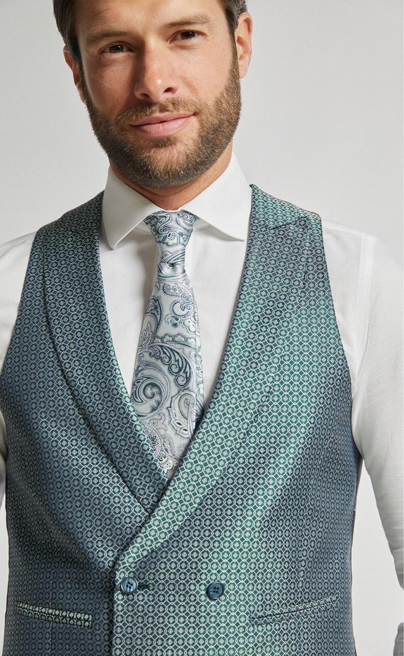 Traje de novio verde de cuadros en tejido lana. Americana con solapa en pico de 1 botón que va en contraste con chaleco cruzado de 3×3 botones y corbata y pañuelo.