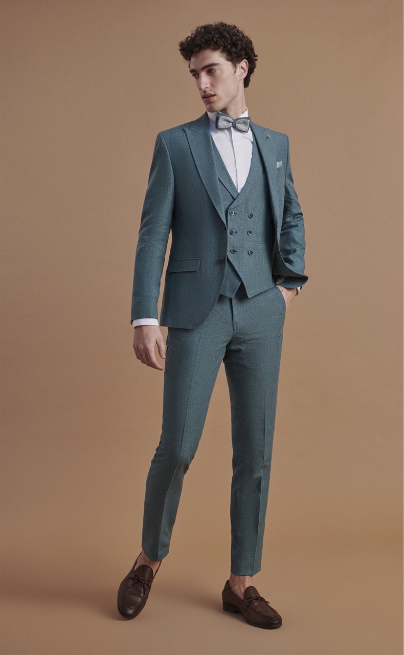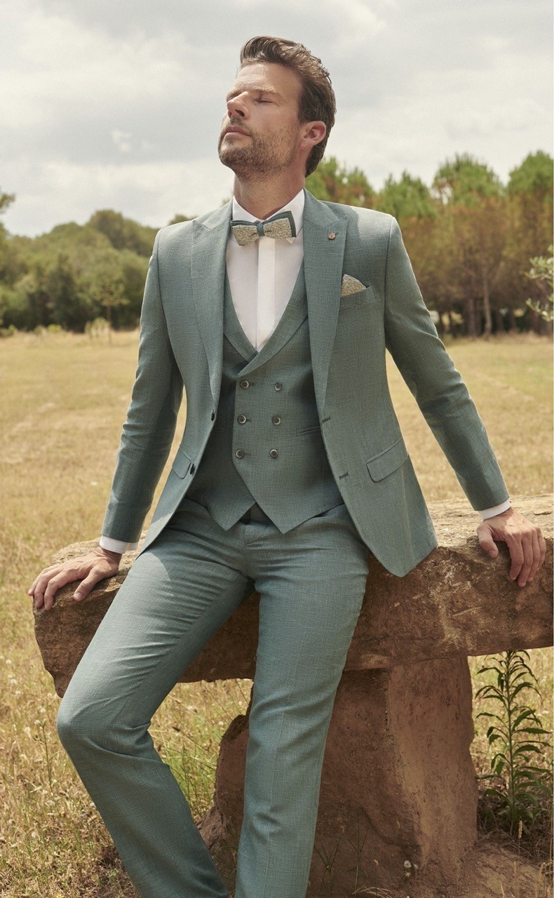 Traje de novio azul claro liso en tejido lino y lana. Americana con solapa en pico de 2 botones que combina com chaleco cruzado espalda en tejido y solapa 3×3 botones , pajarita y pañuelo.