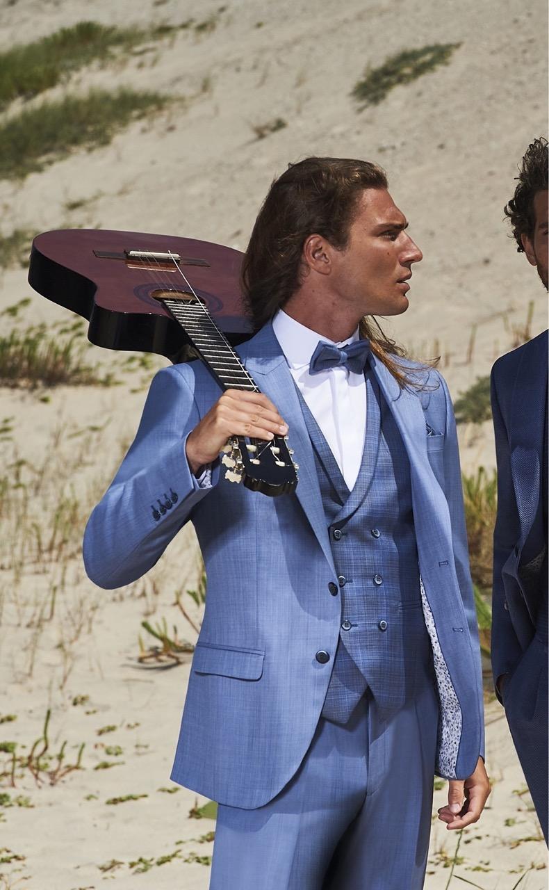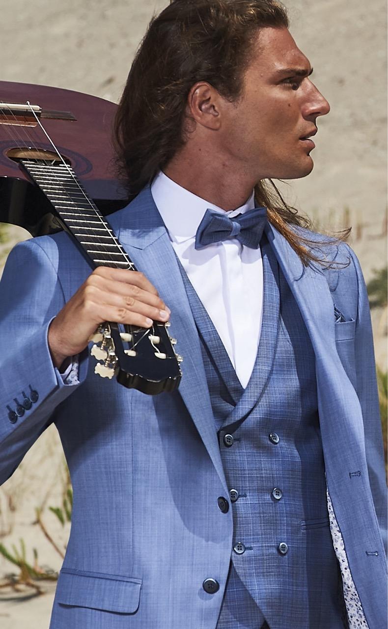 Traje de novio azul liso en tejido lana. Americana con solapa en pico de 2 botones que va en contraste con chaleco cruzado con solapa y con espalda en tejido de 3×3 botones, pajarita y pañuelo.