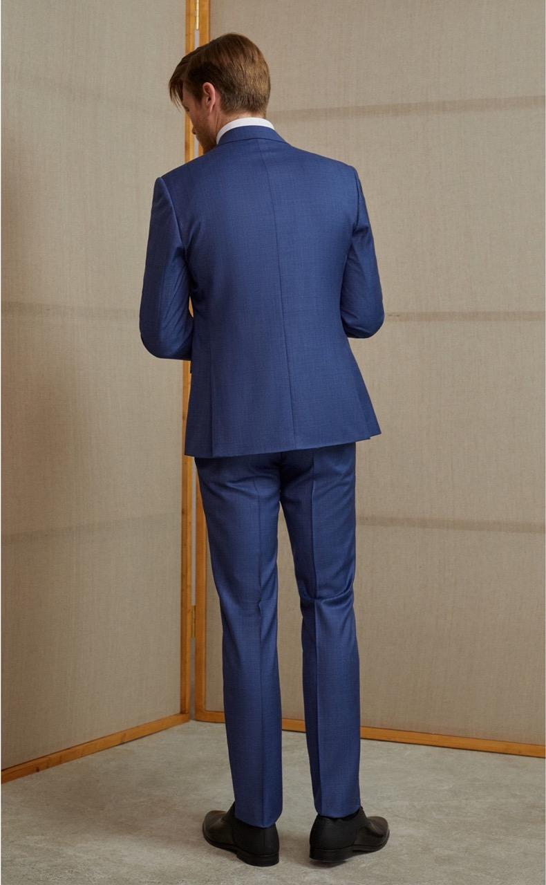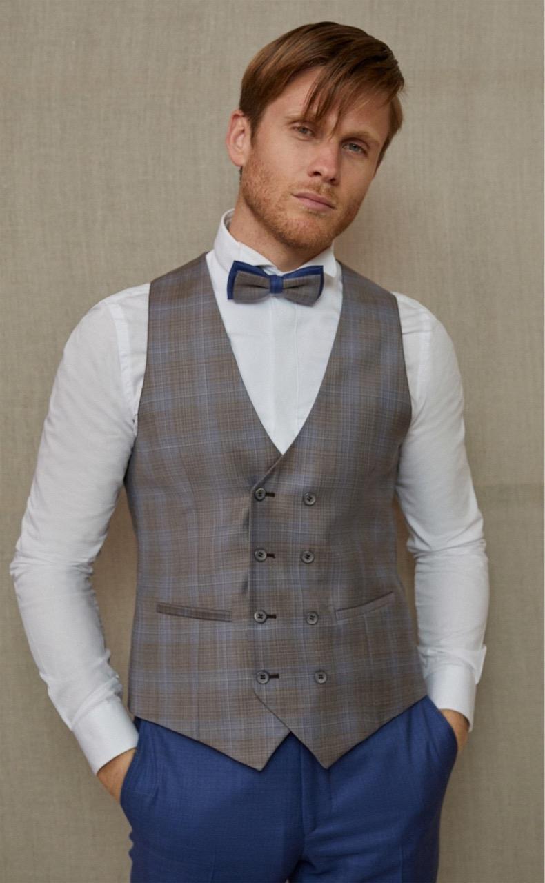 Traje de novio azul liso en tejido lana. Americana con solapa en pico de 2 botones que va en contraste con chaleco cruzado con espalda en tejido de 4×4 botones y pajarita y pañuelo.