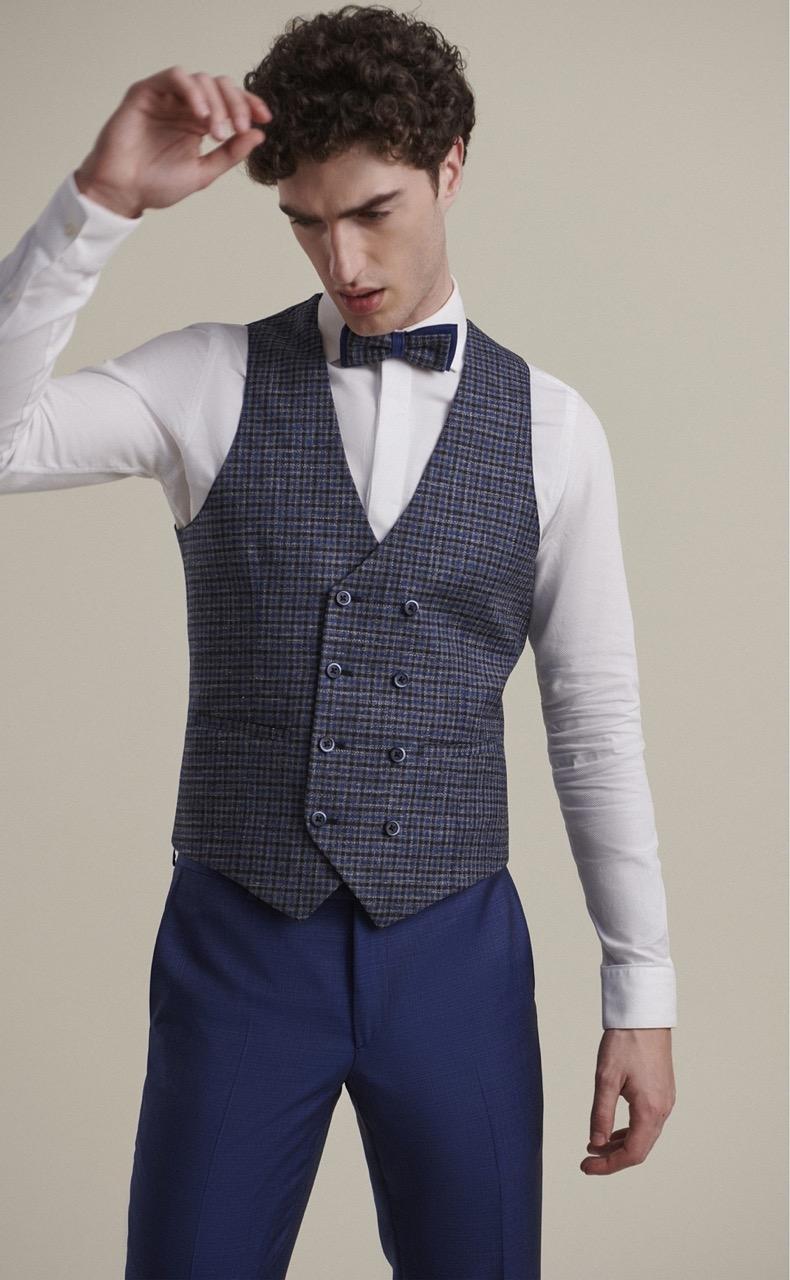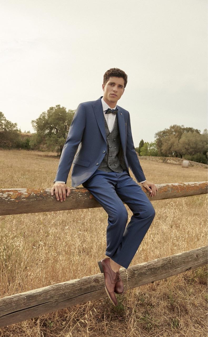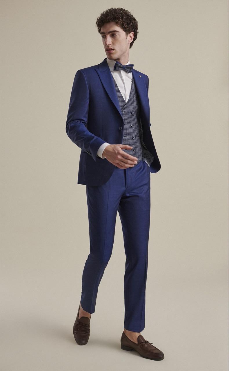 Traje de novio azul medio liso en tejido lana (SUPER 120’S) Americana con solapa en pico de 2 botones que va en contraste con chaleco cruzado con solapa y con espalda en tejido de 4×4 botones , pajarita y pañuelo.