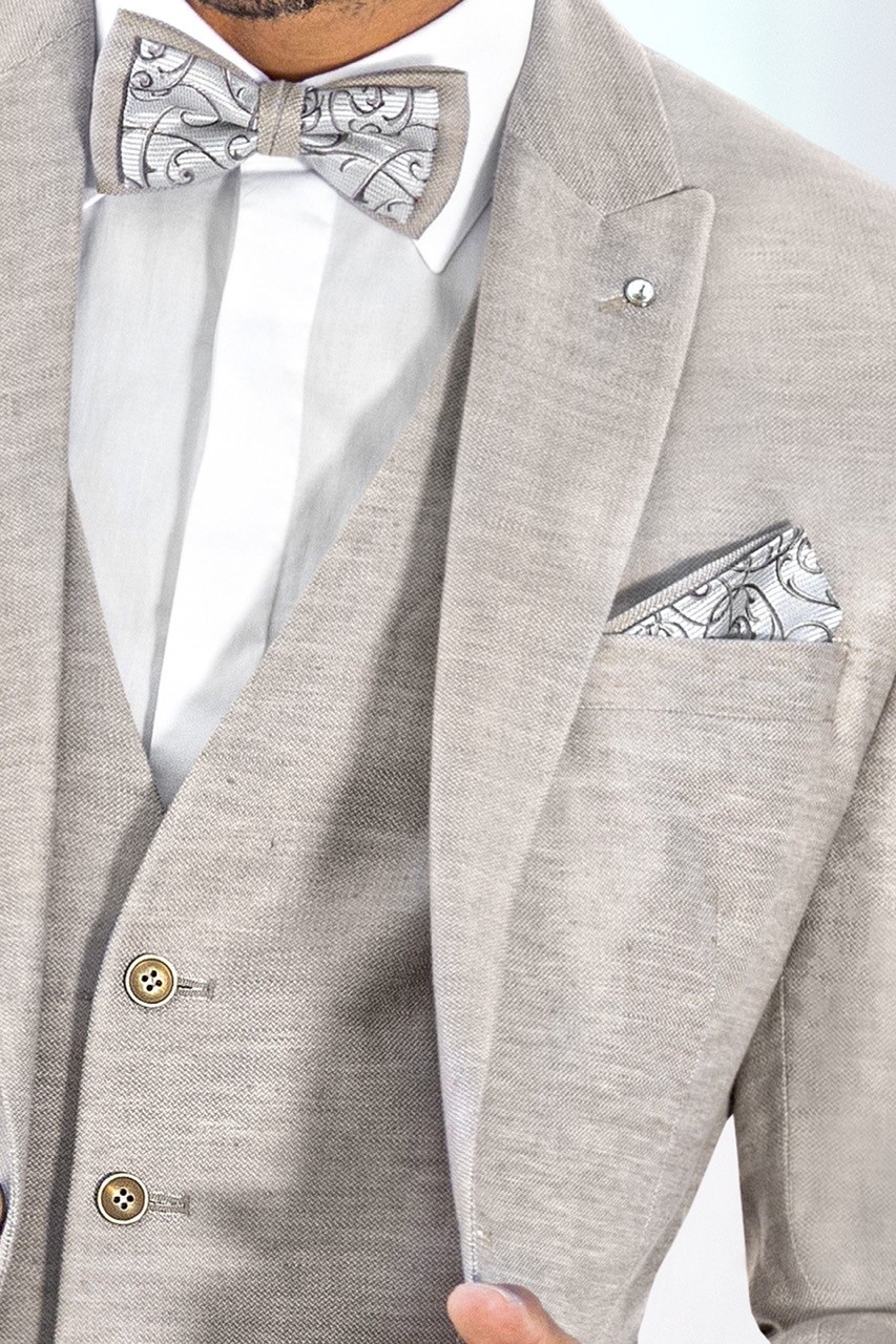 Traje de novio beige liso en tejido lino y algodón. Americana con solapa en pico de 2 botones que va con chaleco con espalda en tejido de 4 botones, pajarita y pañuelo.