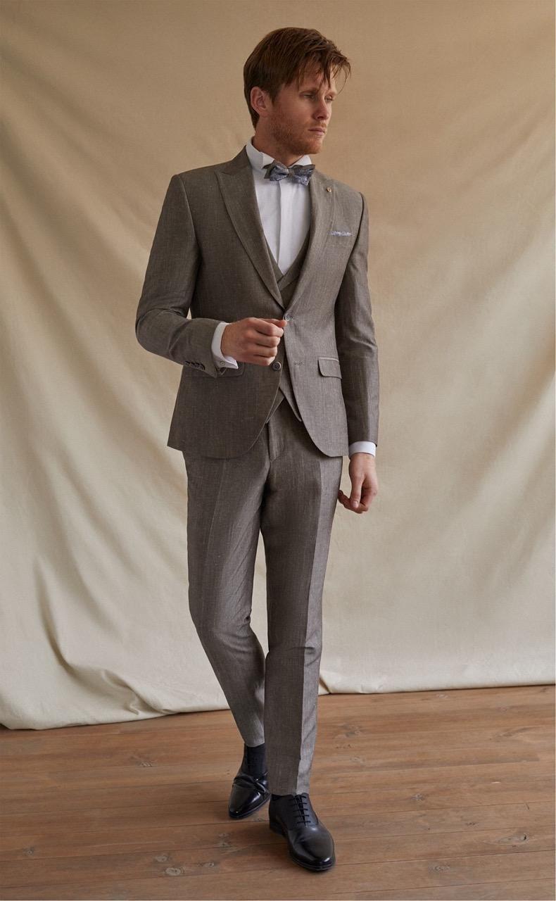 Traje de novio gris liso en tejido lino y lana. Americana con solapa en pico de 2 botones que combina com chaleco cruzado espalda en tejido y solapa 3×3 botones y pajarita y pañuelo.