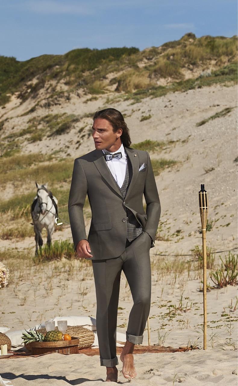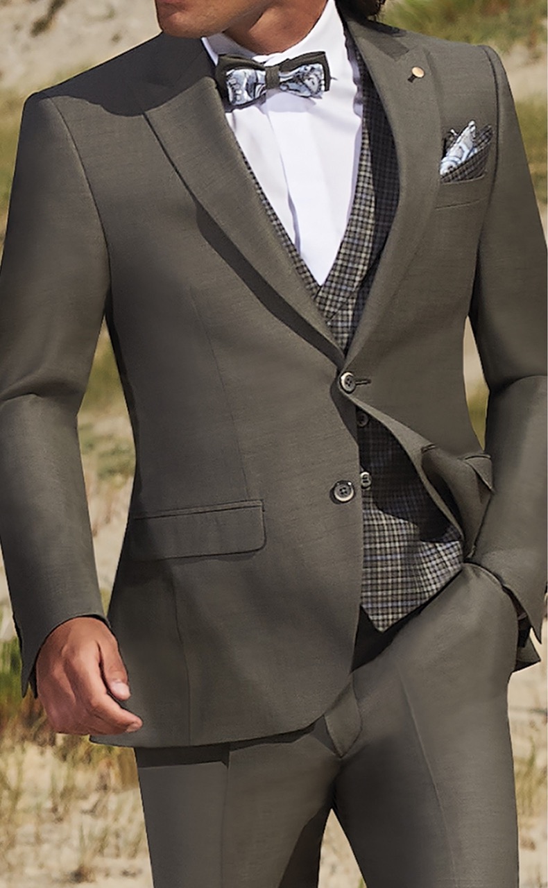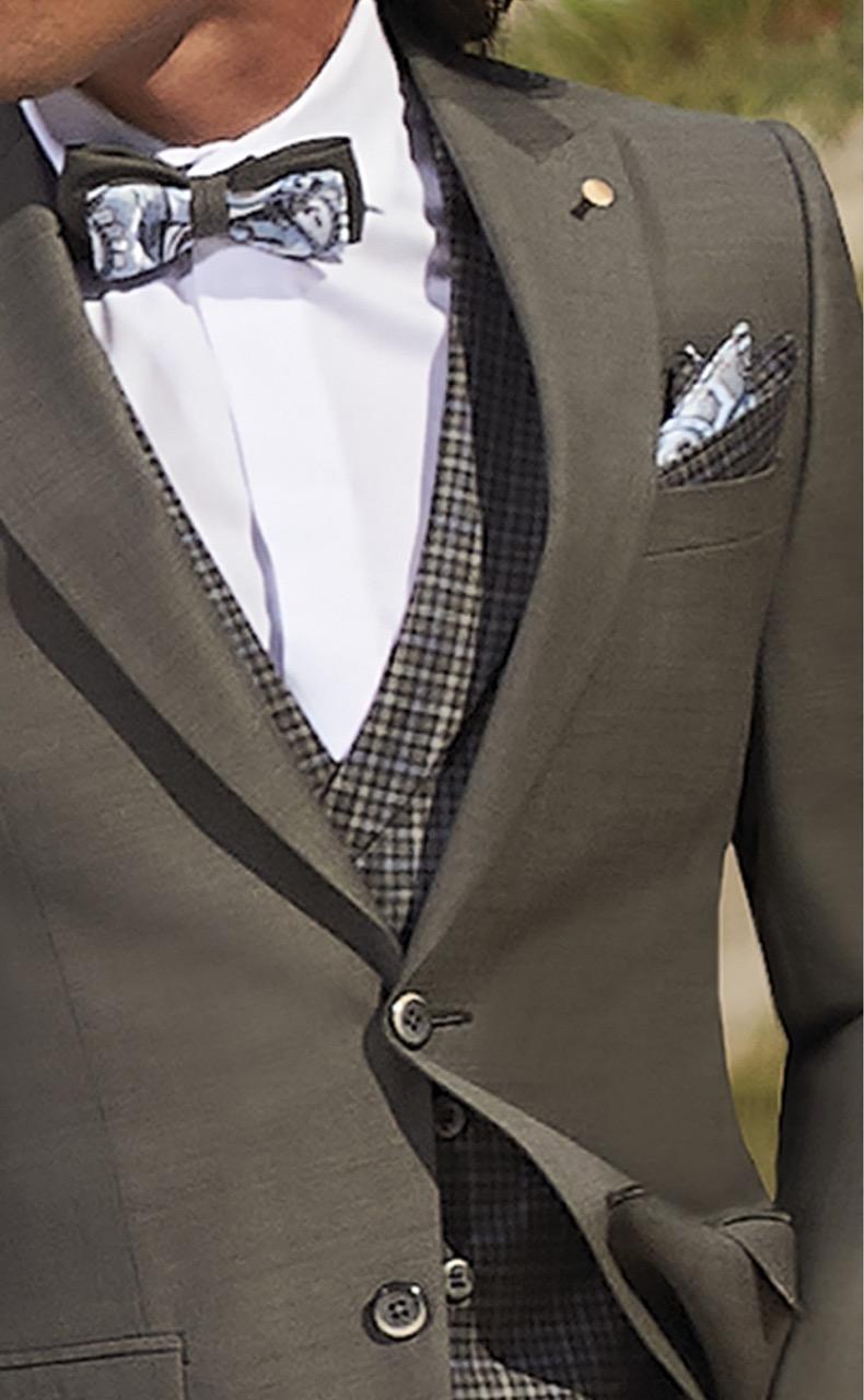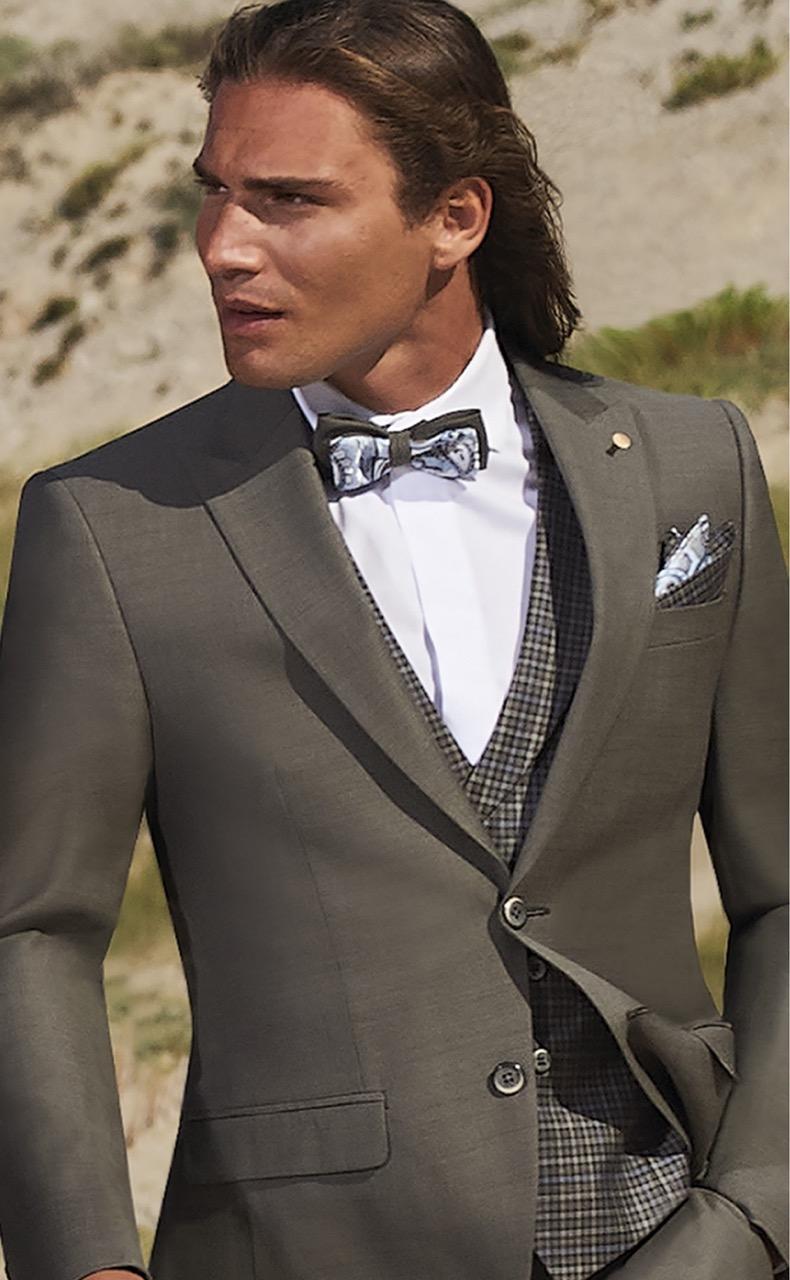 Traje de novio marrón microdibujo en tejido lana. Americana con solapa en pico de 2 botones que va en contraste con chaleco cruzado de 4×4 botones, pajarita y pañuelo.
