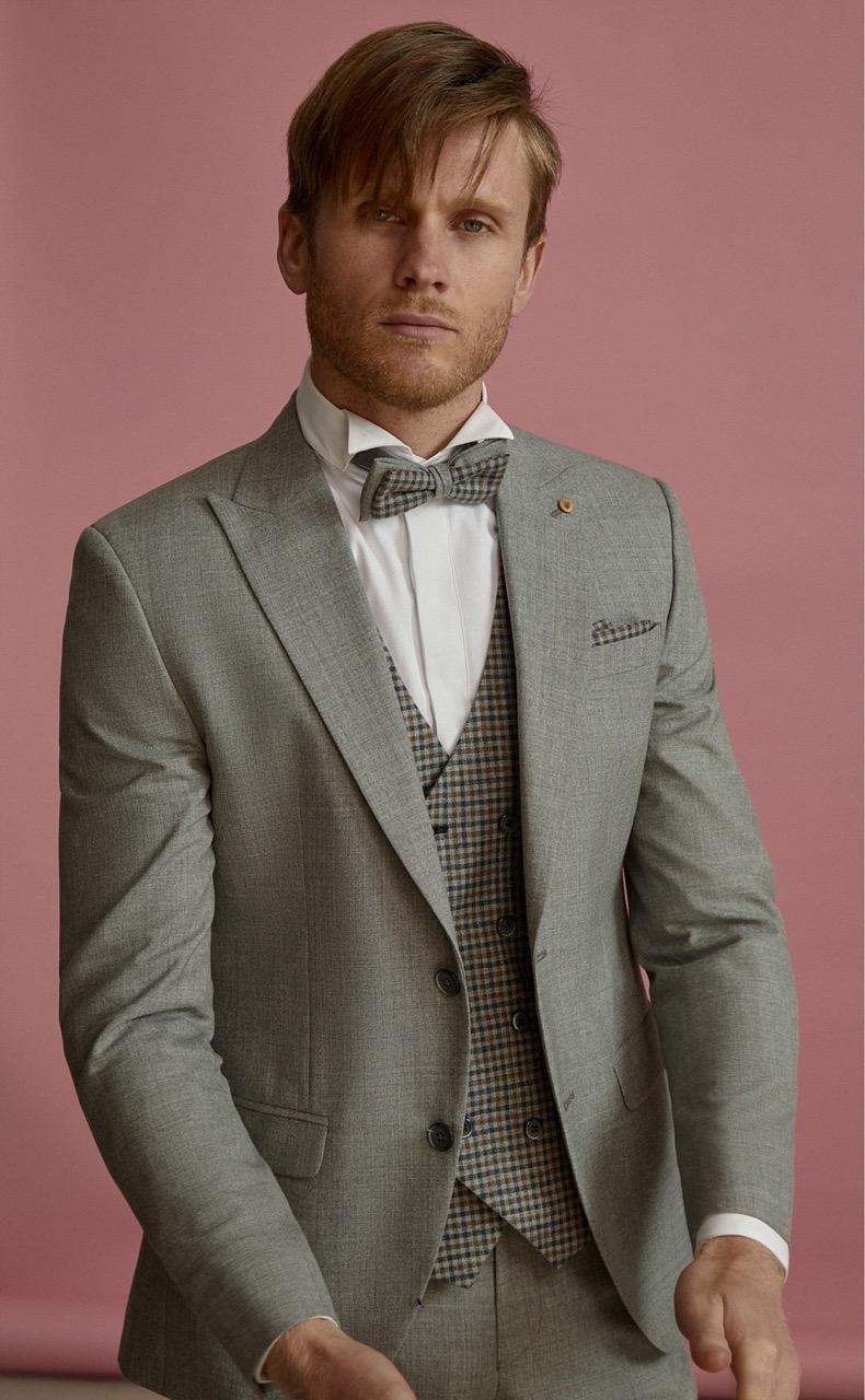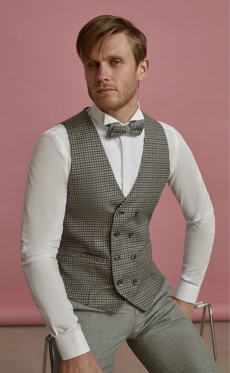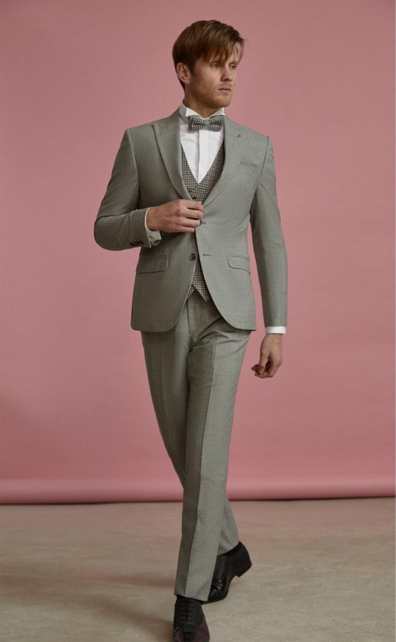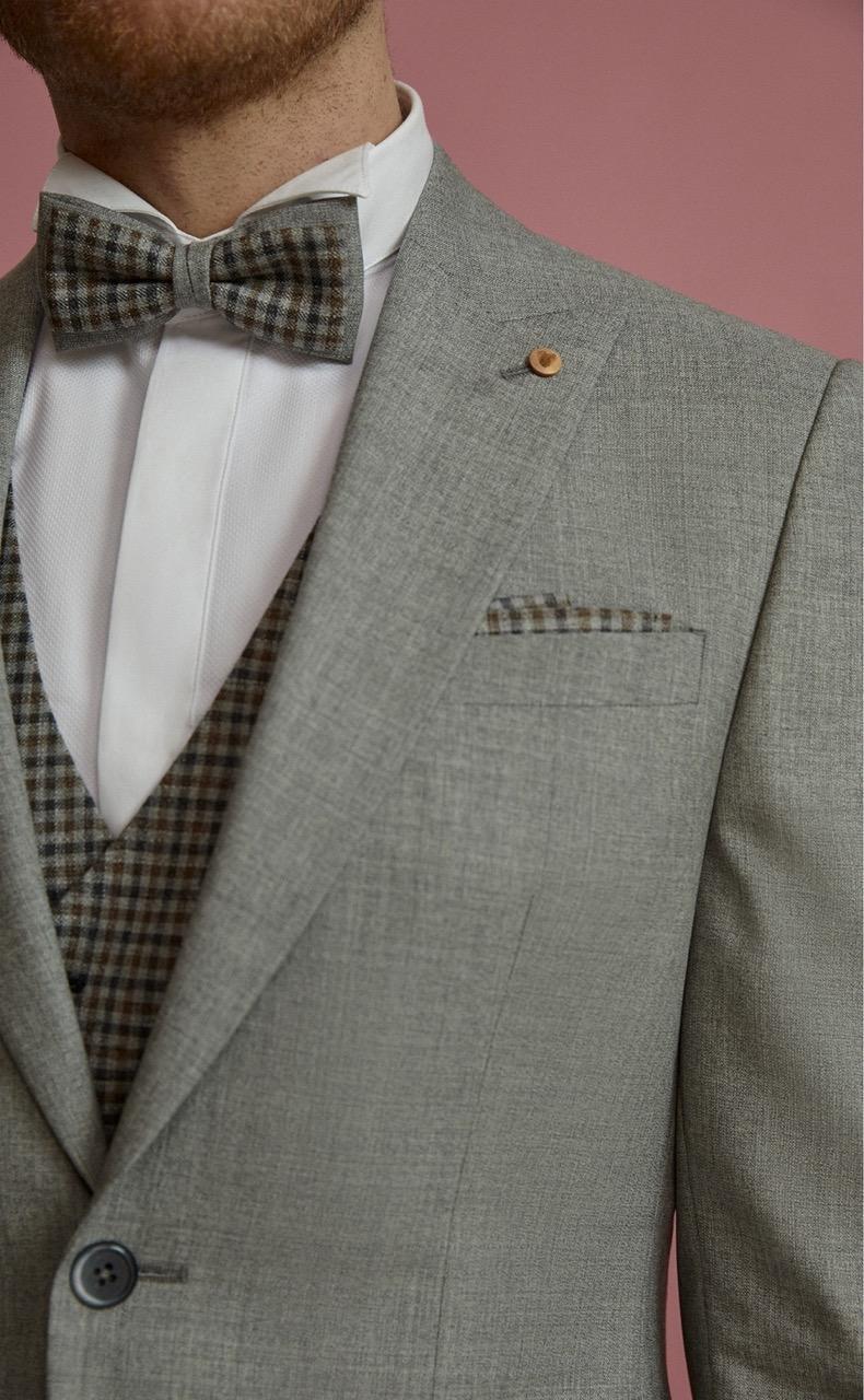 Traje de novio verde liso en tejido lana. Americana con solapa en pico de 2 botones que va en contraste con chaleco cruzado con espalda en tejido de 4×4 botones y pajarita y pañuelo.