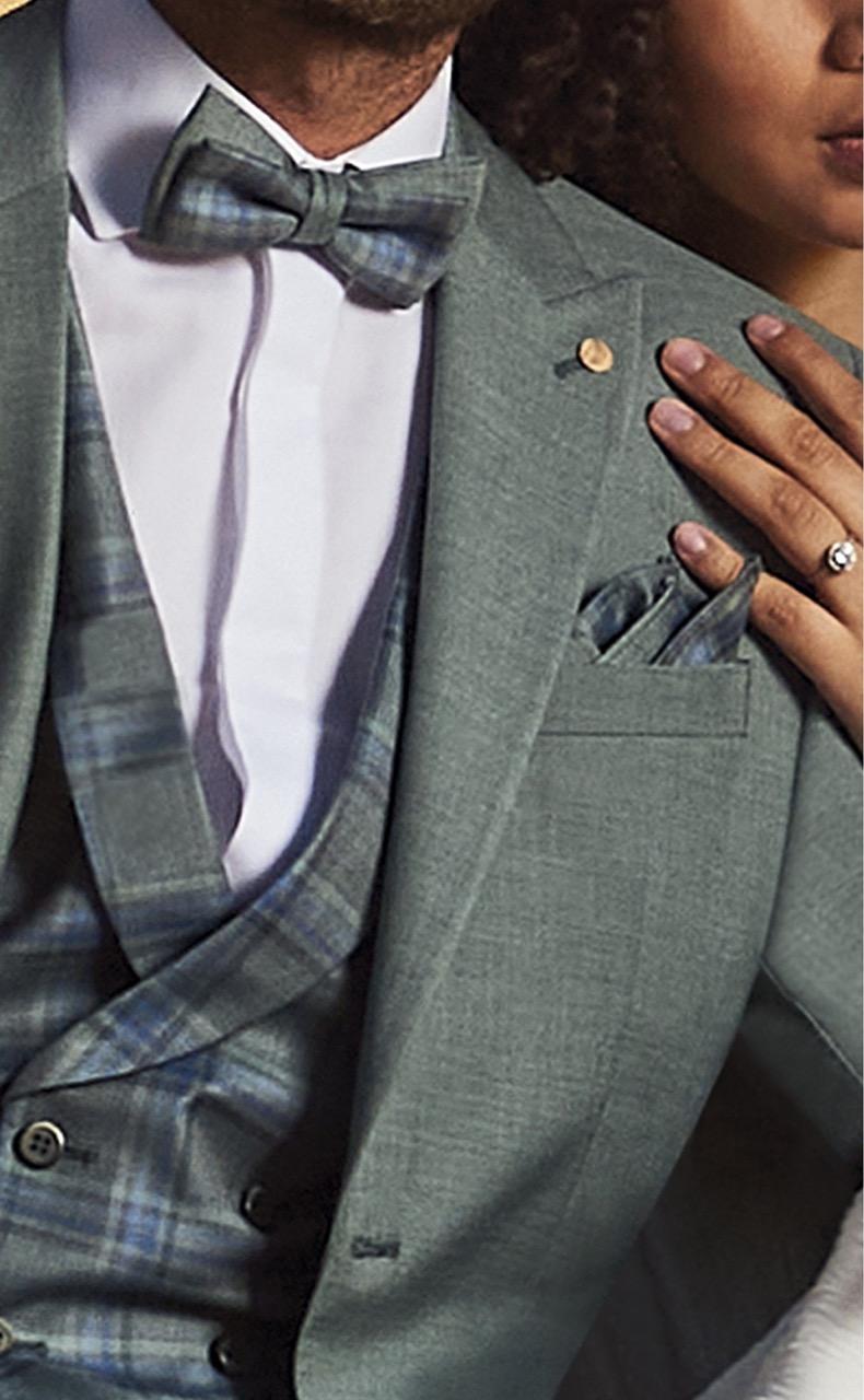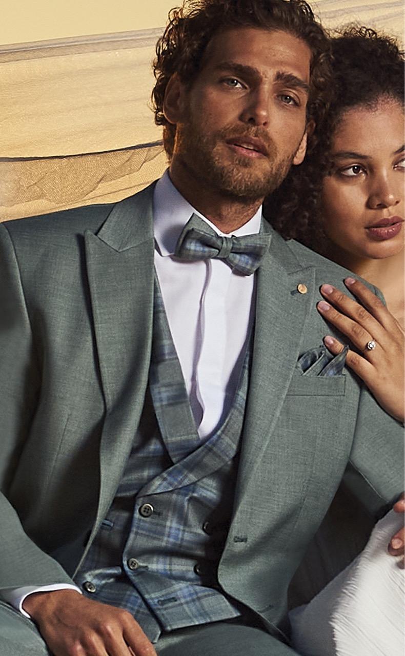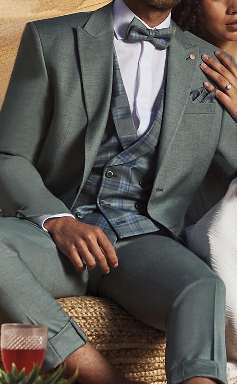 Traje de novio verde liso en tejido lana, poliéster, viscosa y elastano. Americana con solapa en pico de 2 botones que va en contraste con chaleco cruzado con solapa y con espalda en tejido de 3×3 botones, pajarita y pañuelo.