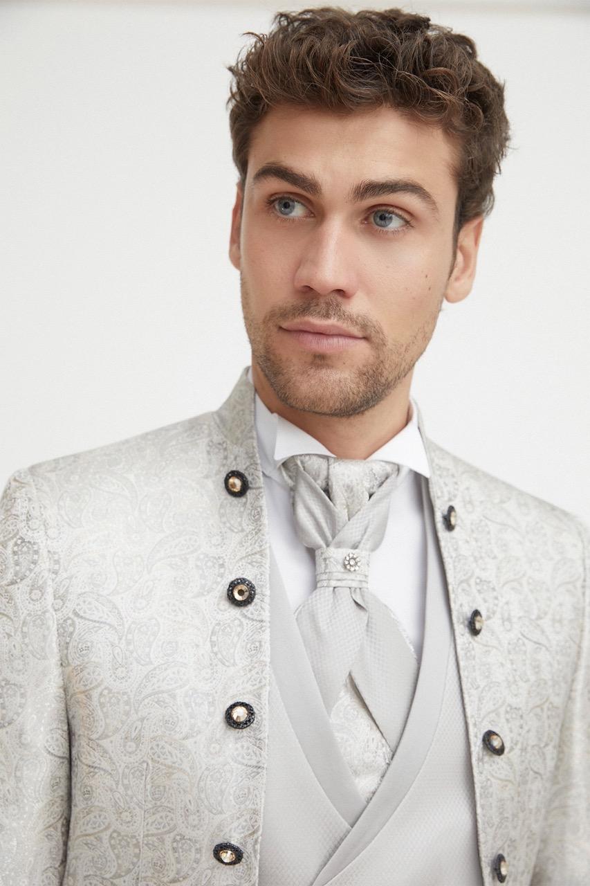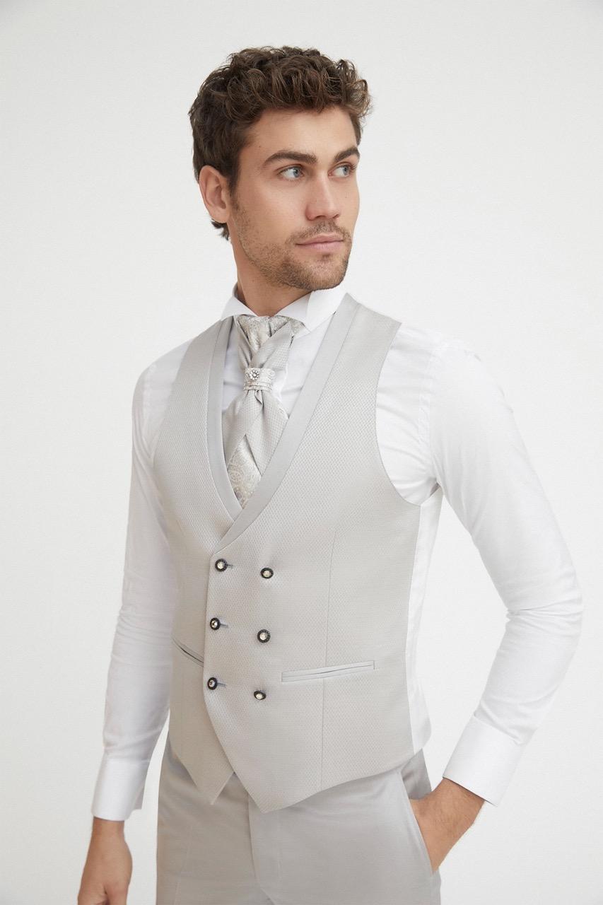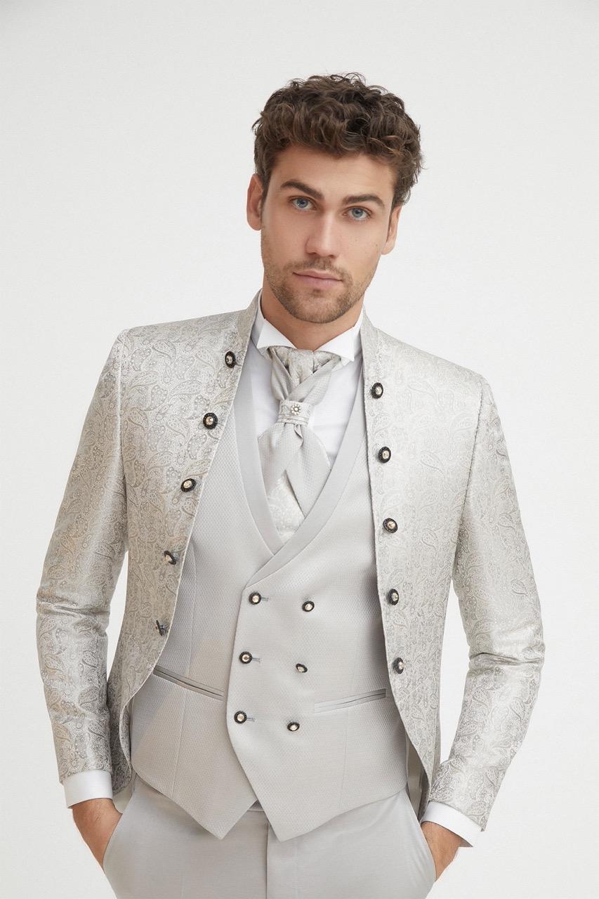 Traje de novio beige brocado en tejido acetato y poliéster. Americana con cuello mao, sin botones que va en contraste con chaleco cruzado de 3×3 botones y corbatón.