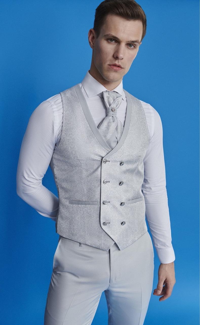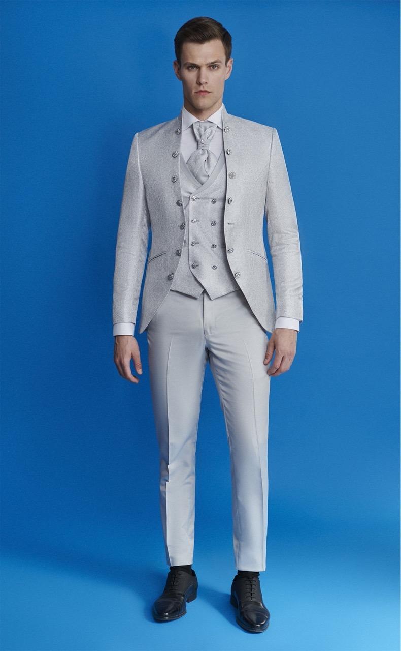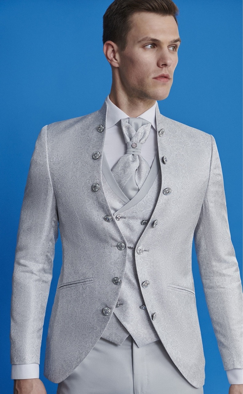 Traje de novio beige microdibujo en tejido acetato y poliéster. Americana con cuello mao, 1 botón que combina com chaleco cruzado espalda en tejido y solapa 4×4 botones y corbatón.