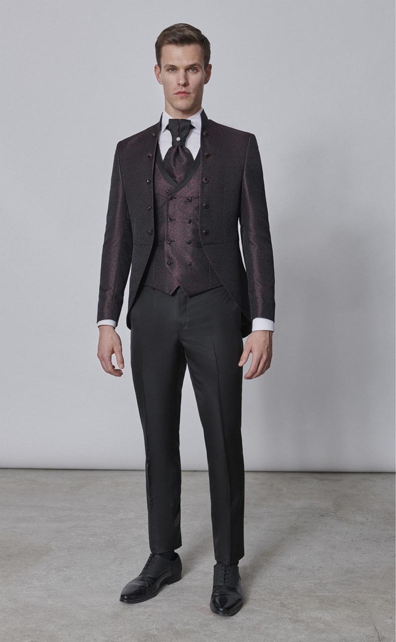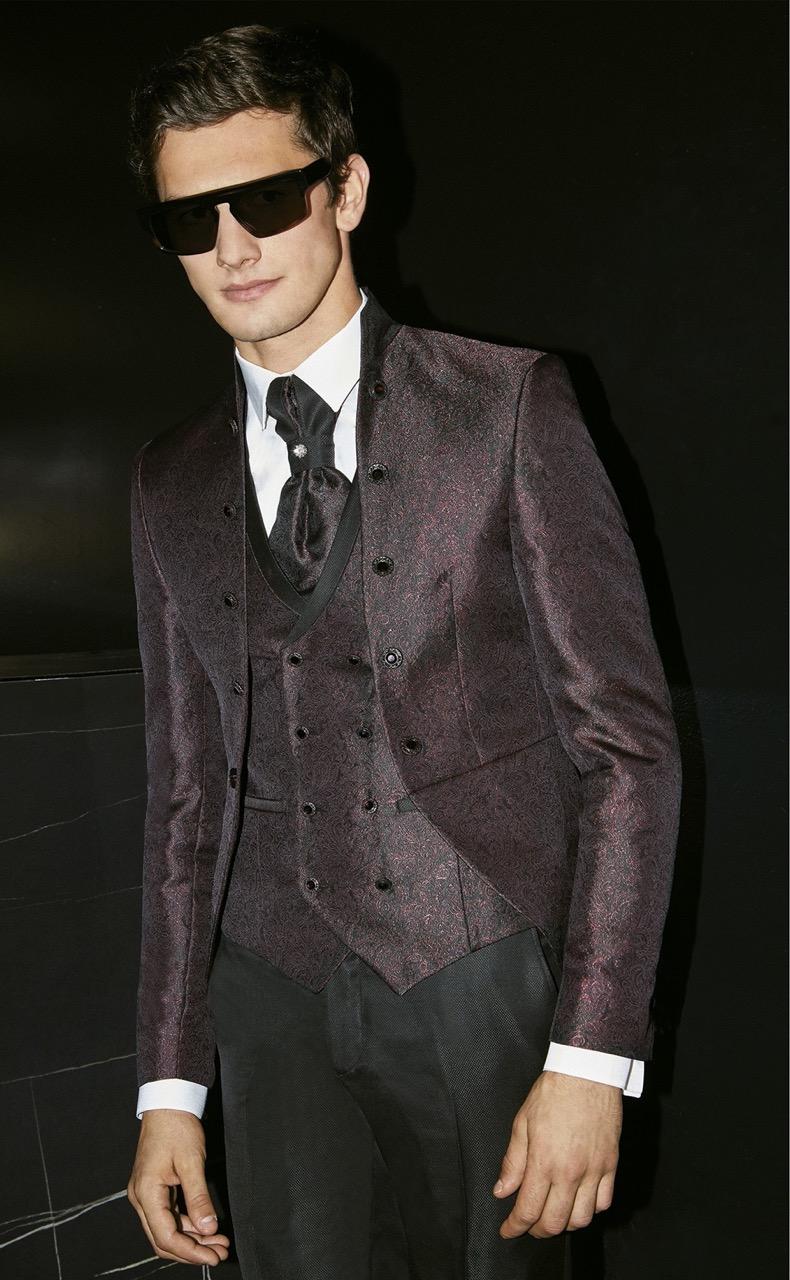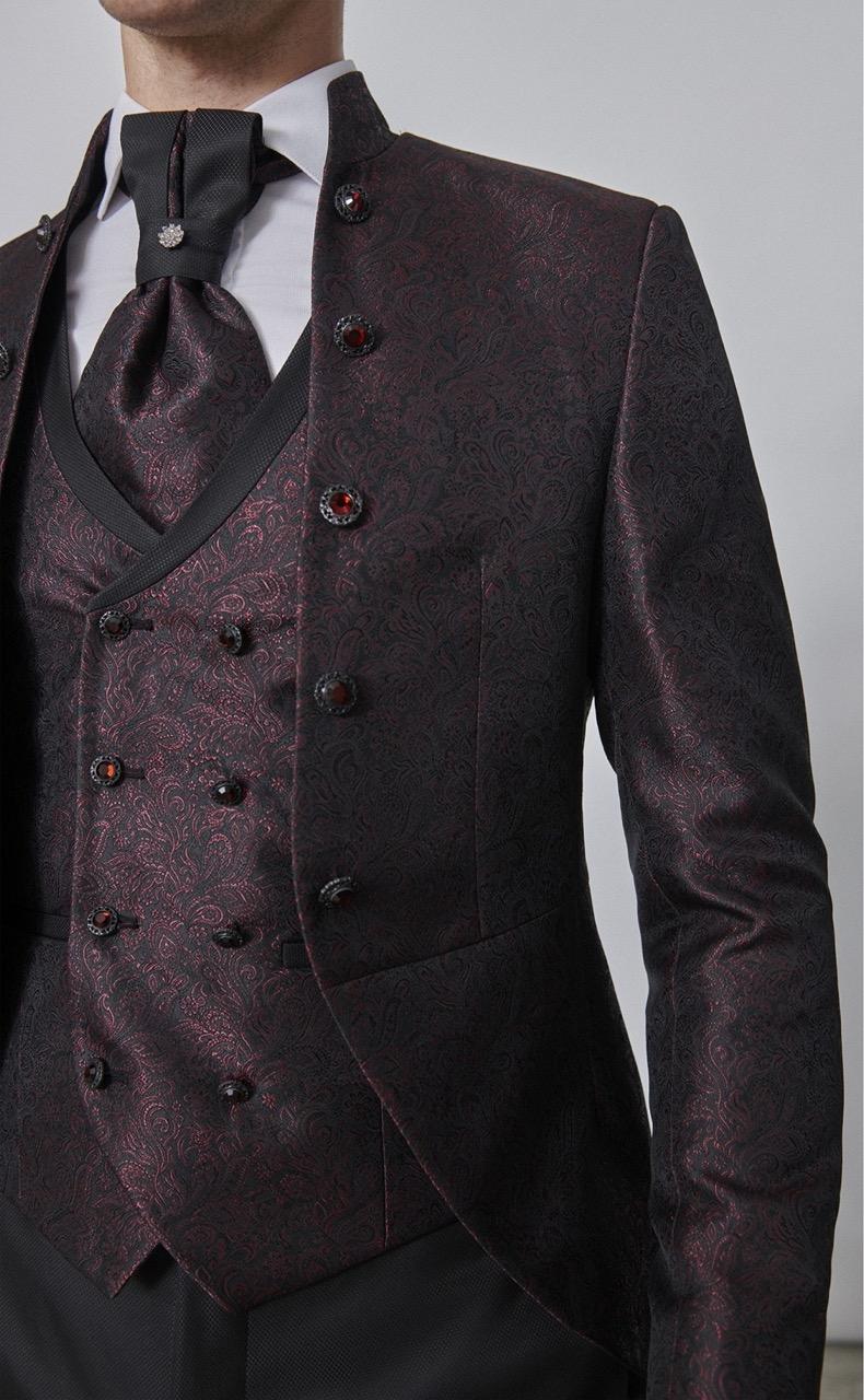 Traje de novio burdeos microdibujo en tejido poliéster. Americana con cuello mao, sin botones que combina com chaleco cruzado espalda en tejido y solapa 4×4 botones y corbatón.