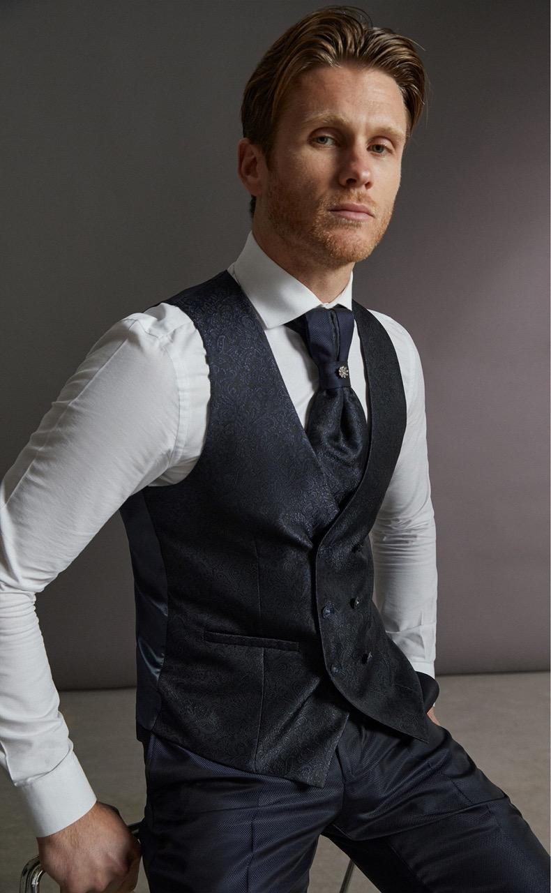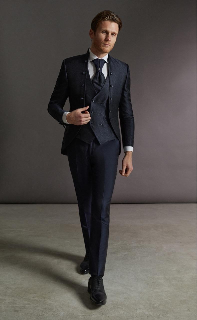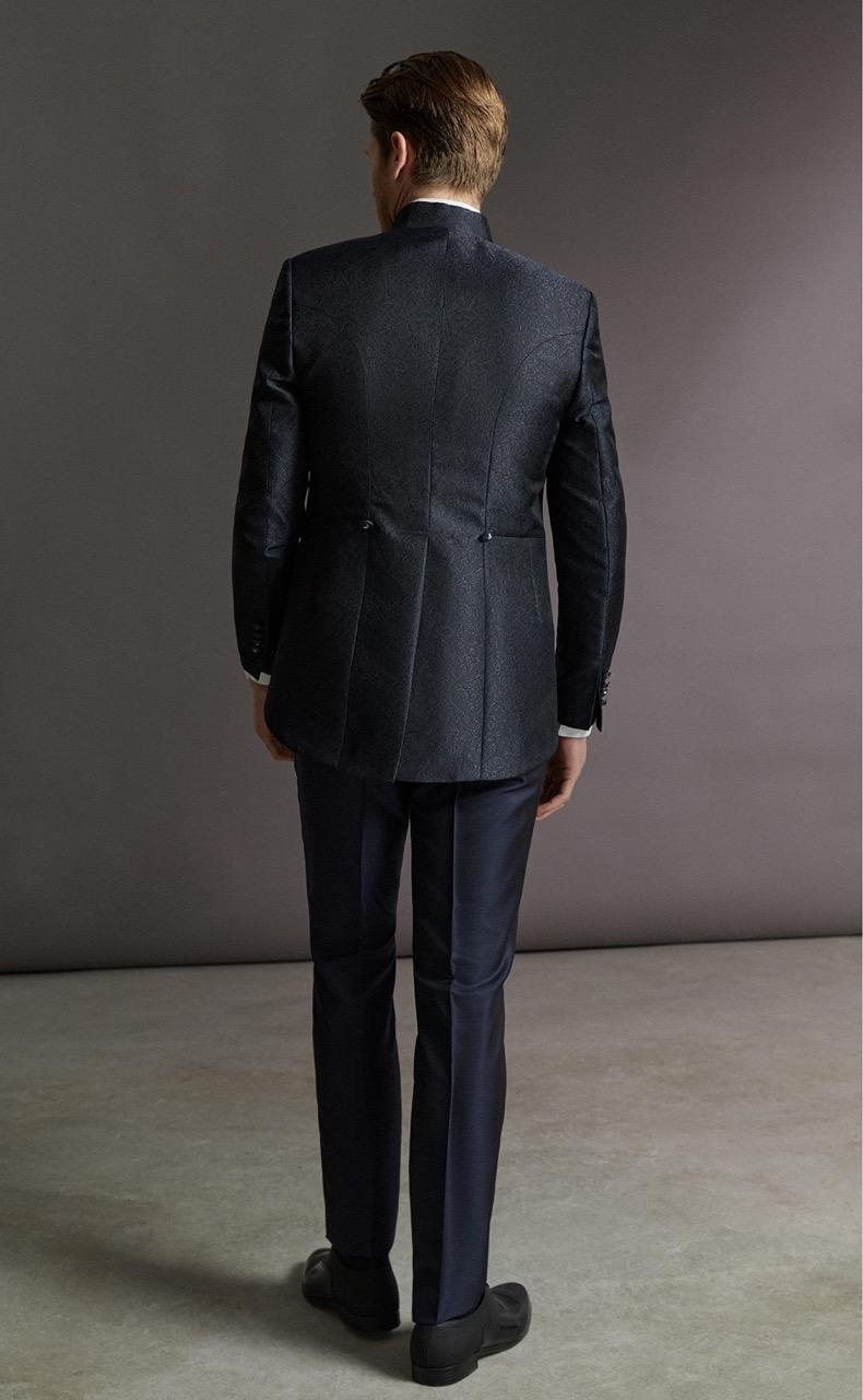 Traje de novio azul brocado en tejido poliéster. Americana con cuello mao, sin botones que va en contraste con chaleco cruzado con espalda en tejido de 3×3 botones y corbatón.