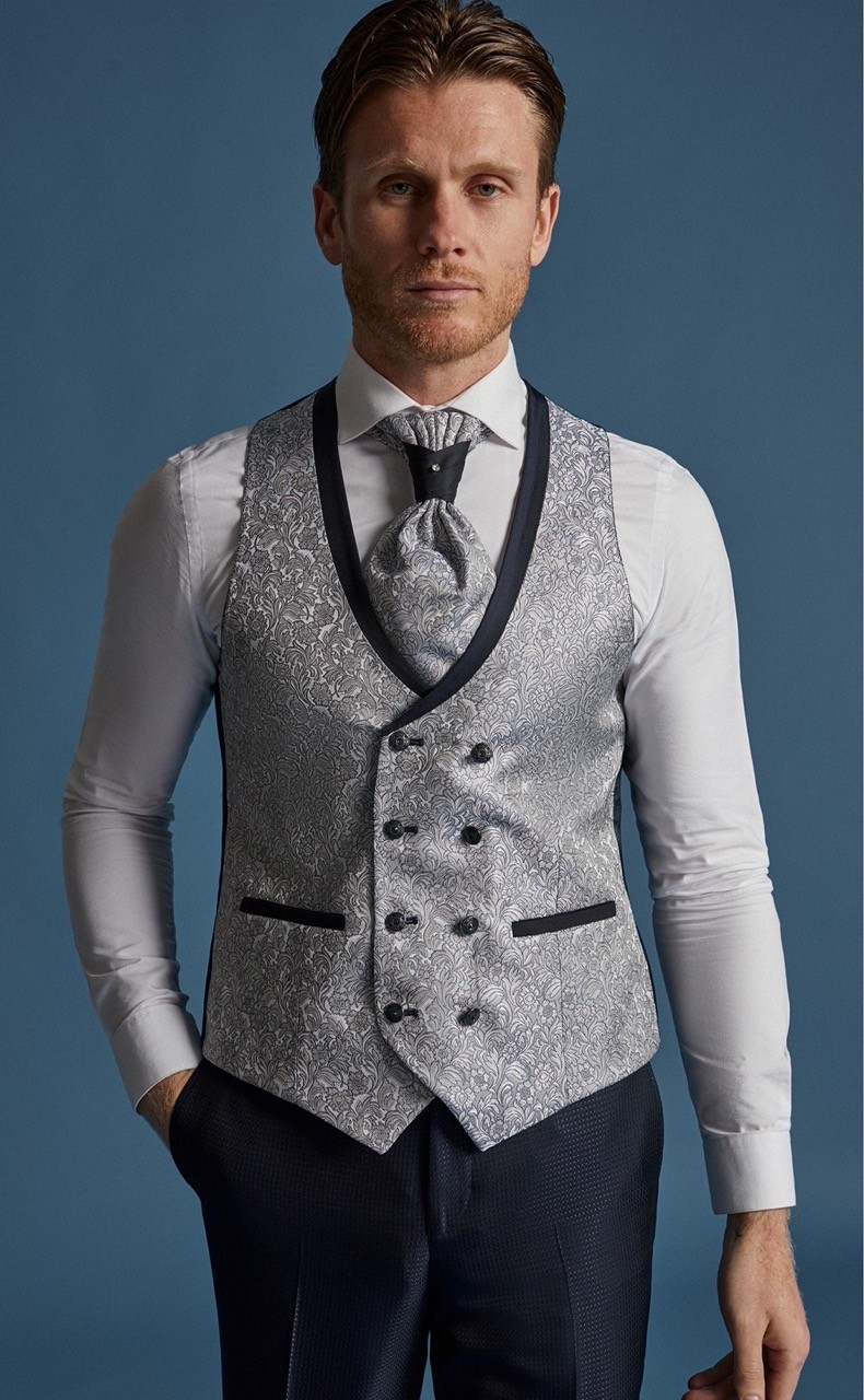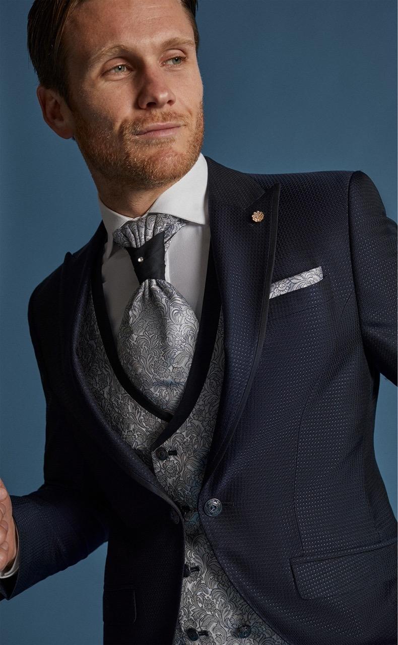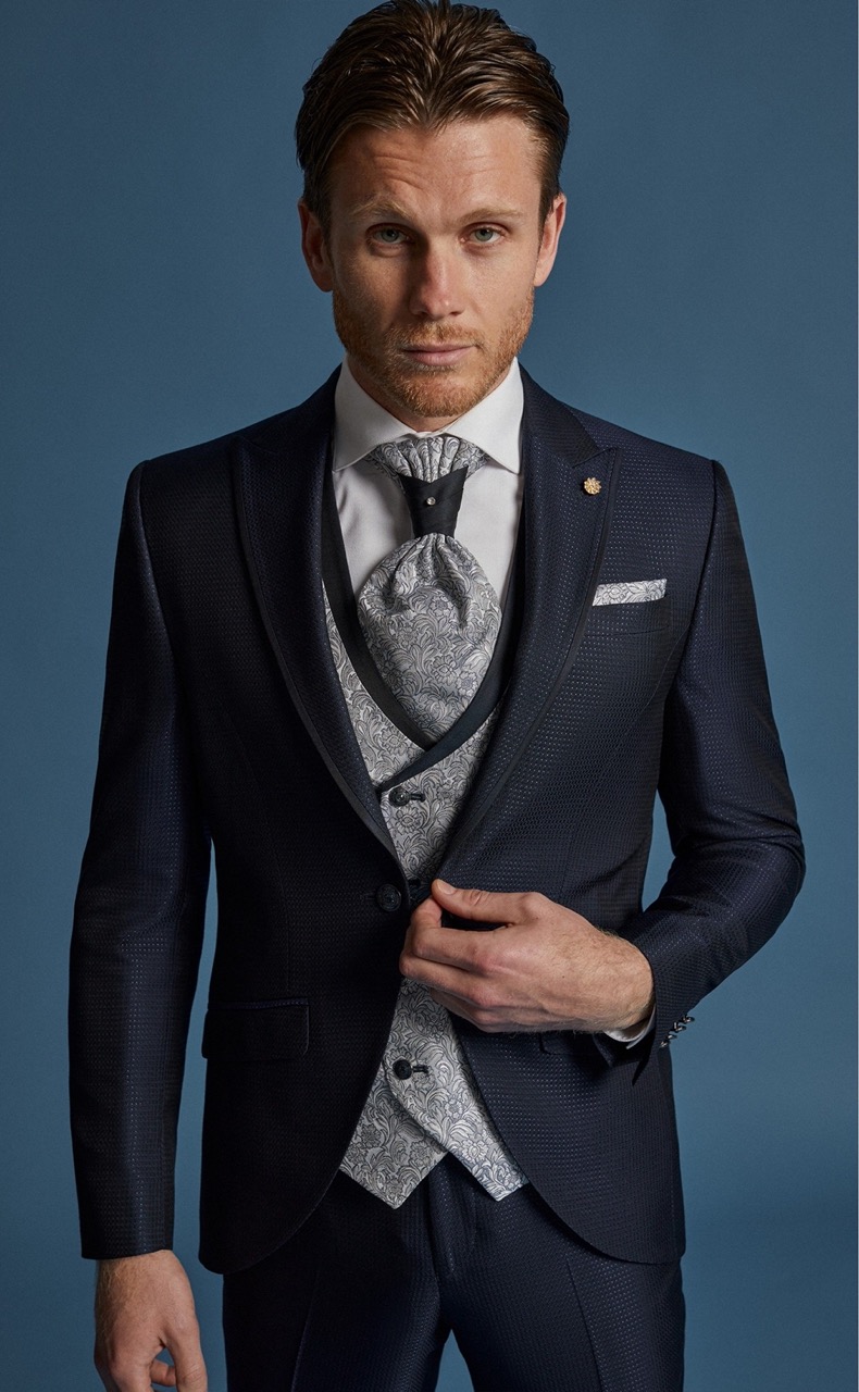 Traje de novio azul microdibujo en tejido acetato y lana. Americana con solapa en pico de 1 botón que va en contraste con chaleco cruzado con espalda en tejido de 4×4 botones y corbatón y pañuelo.