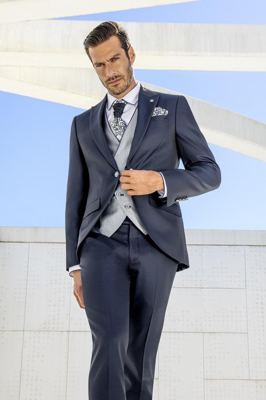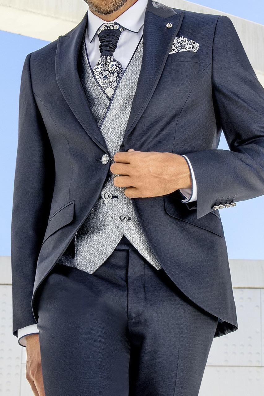 Traje de novio azul microdibujo en tejido acetato y lana. Americana con solapa en pico de 1 botón que va en contraste con chaleco cruzado de 4 botones, corbatón y pañuelo.