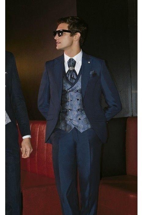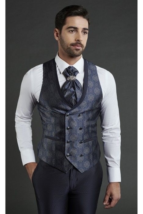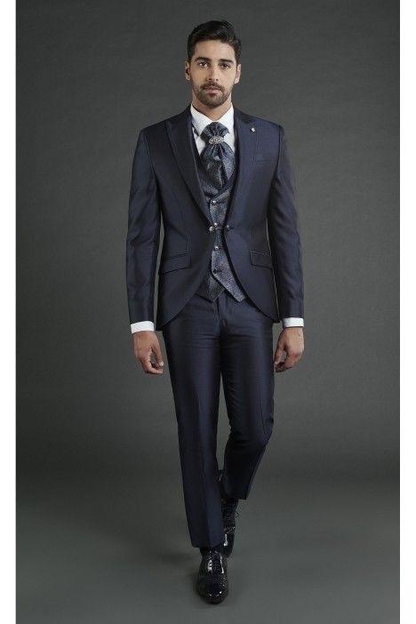 Traje de novio azul oscuro liso en tejido acetato y lana. Americana con solapa en pico de 1 botón que va en contraste con chaleco cruzado con solapa y con espalda en tejido de 4×4 botones y corbatón.