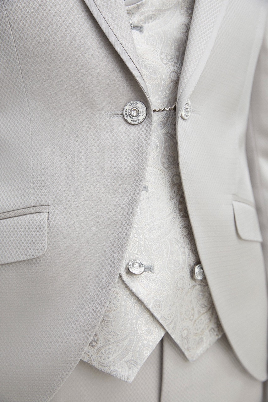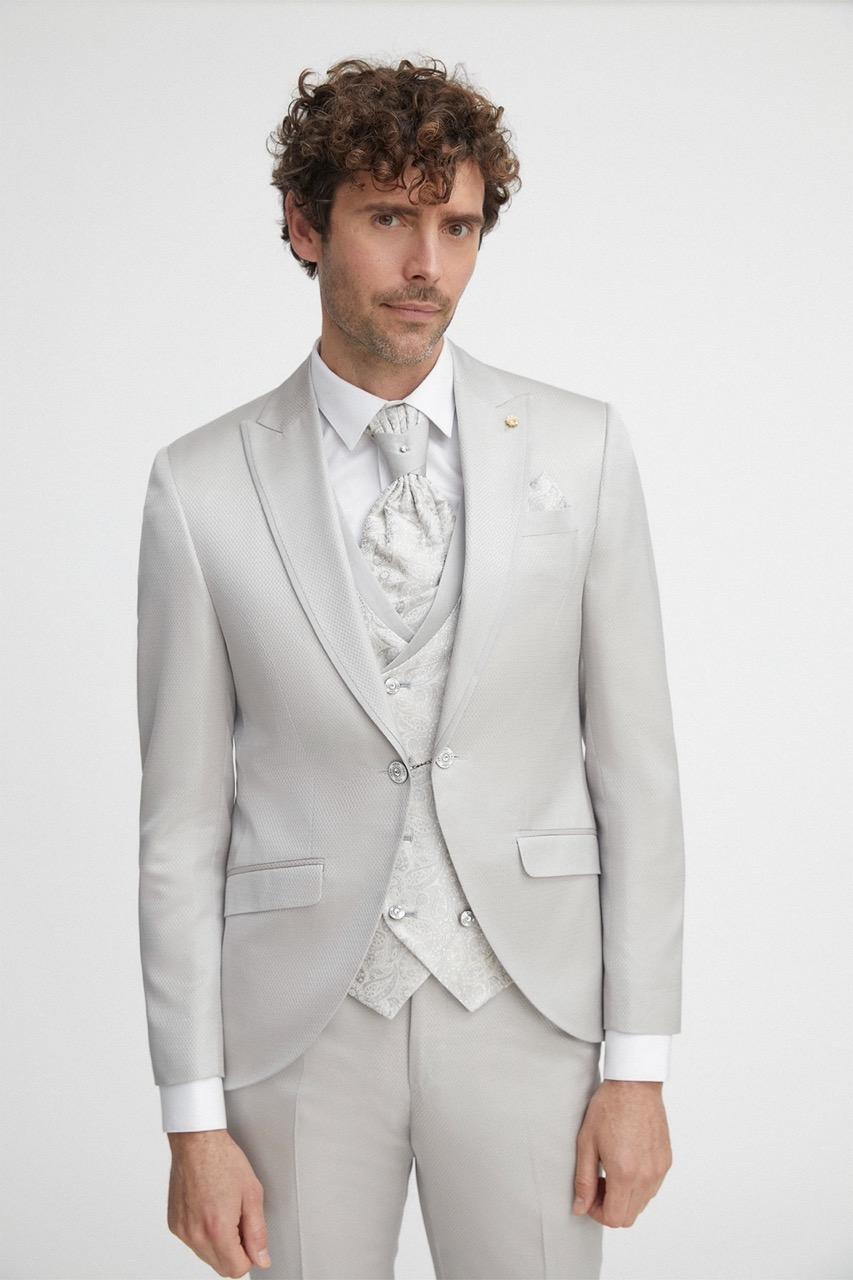 Traje de novio beige microdibujo en tejido acetato y lana. Americana con solapa en pico de 1 botón que va en contraste con chaleco cruzado de 4×4 botones, corbatón y pañuelo.