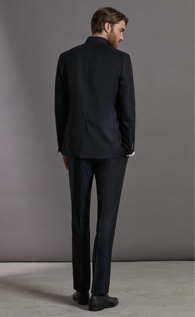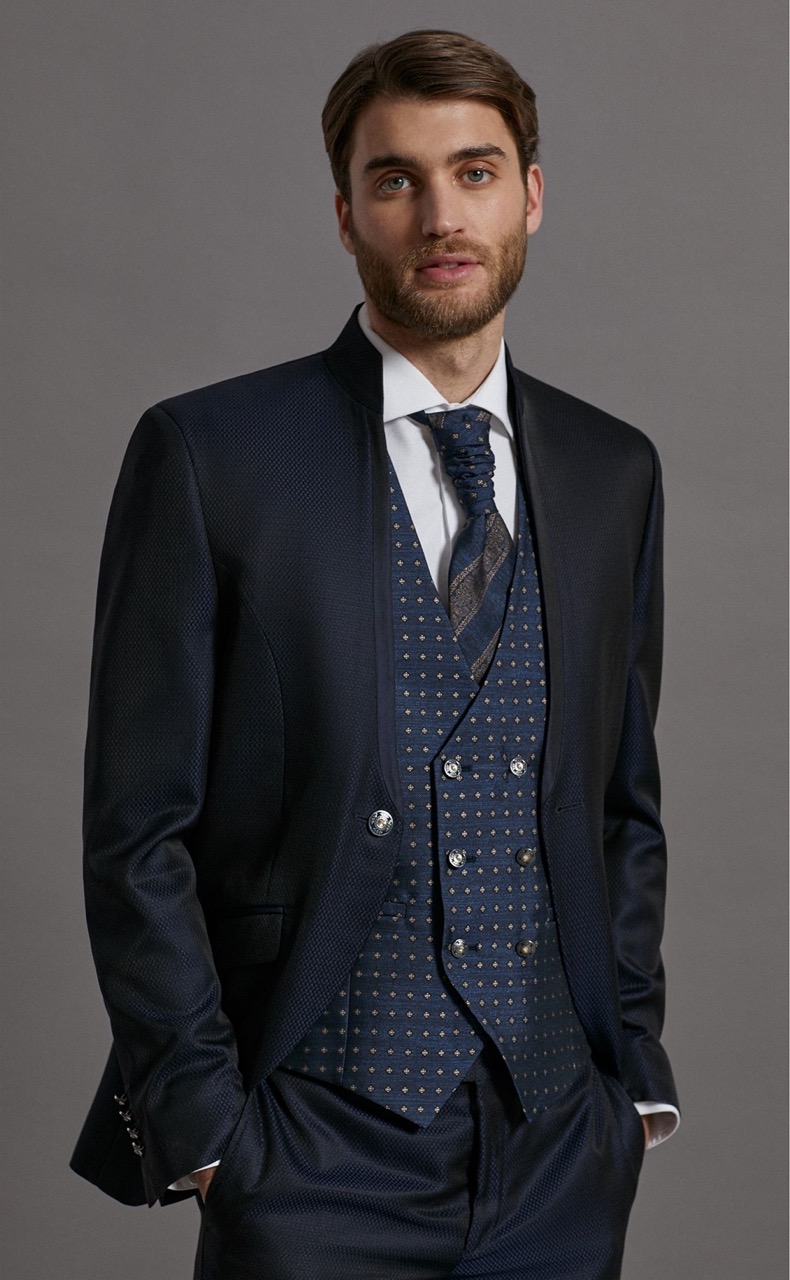 Traje de novio negro liso en tejido acetato y lana. Americana con cuello mao, 1 botón que va en contraste con chaleco cruzado con espalda en tejido de 3×3 botones y corbatón.