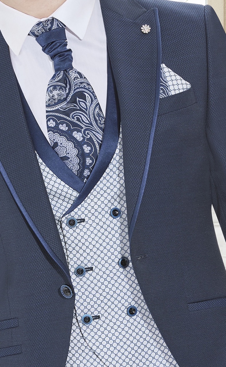 • Chaleco cruzado azul y perla con cordon en contraste y 3×3 botones